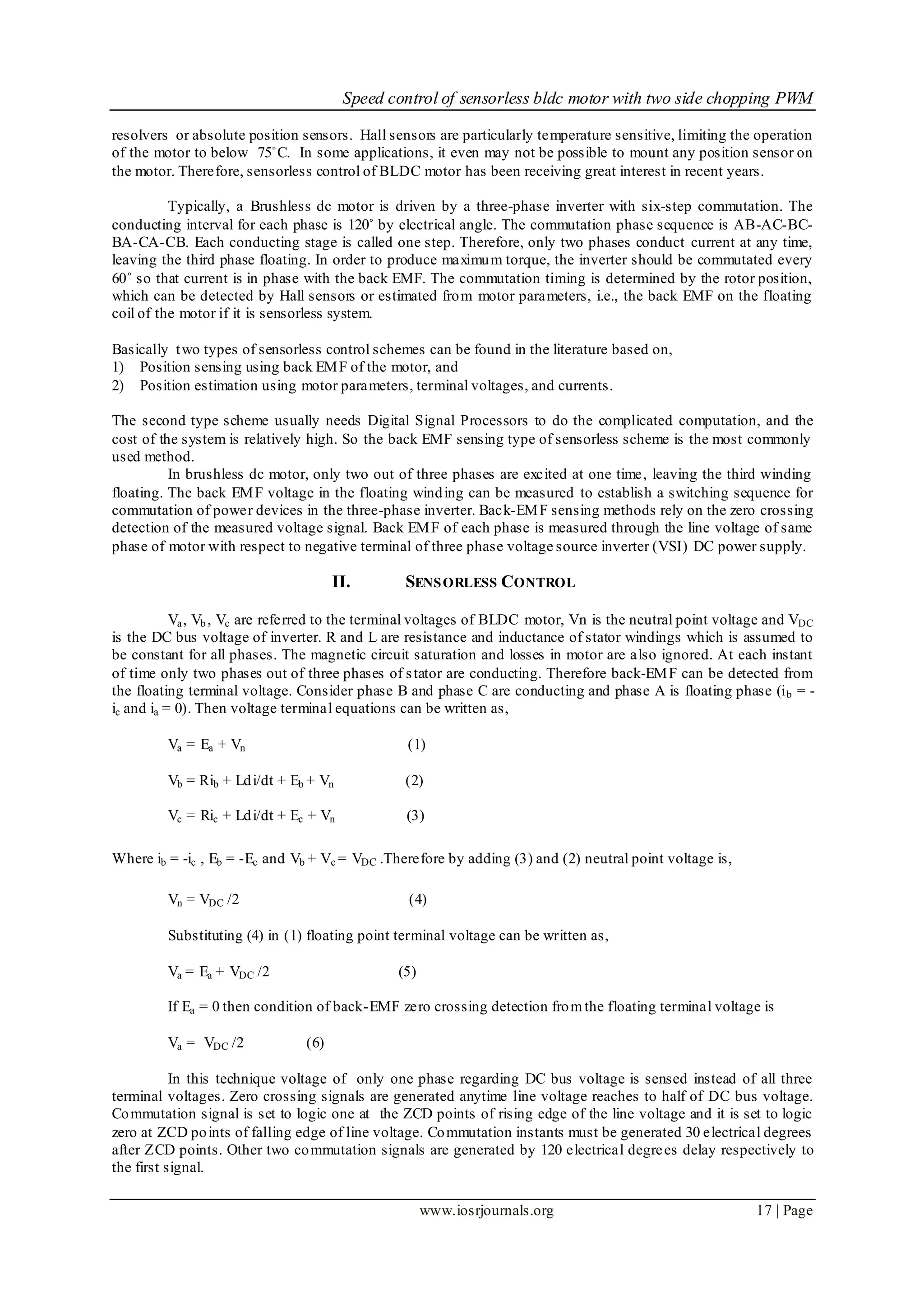 This document discusses a new optimized sensorless drive technique for speed control of a brushless DC motor (BLDC) based on back electromotive force (EMF) zero crossing detection of only one phase voltage. A PI controller with two side chopping pulse width modulation is used to control the motor speed. Simulation results show that the proposed technique can successfully control the motor speed from 600 to 10,000 rpm while detecting the back EMF zero crossings from the voltage of a single phase. This sensorless commutation method reduces the sensing circuitry and cost compared to conventional BLDC motor drives.