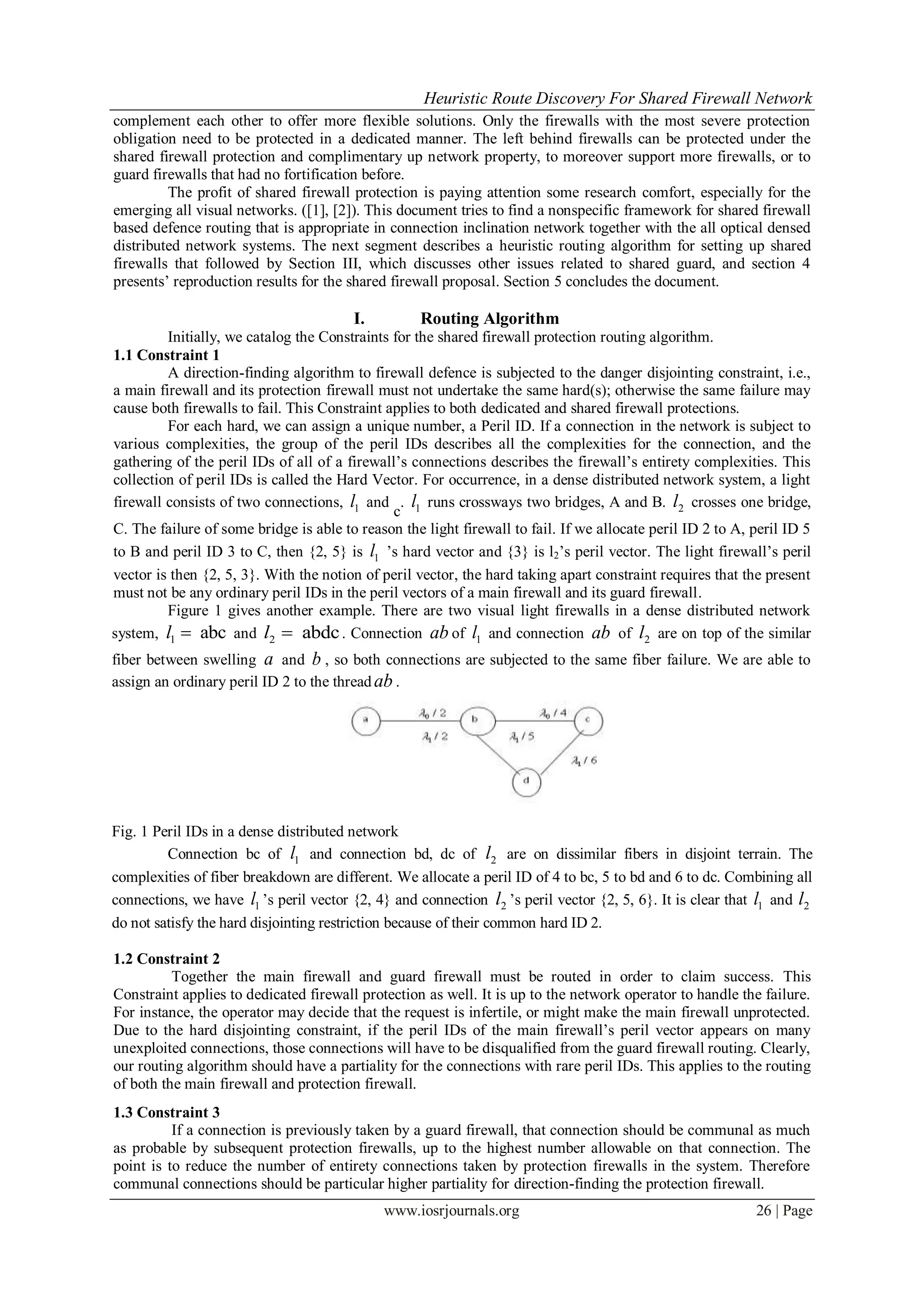 This document proposes a heuristic routing algorithm for shared firewall protection networks. It begins by outlining five constraints for such an algorithm: 1) the risk disjointing constraint, which requires that a main firewall and its protection firewall do not share any common risks; 2) both the main and protection firewalls must be routed successfully; 3) connections previously used by protection firewalls should be shared as much as possible to reduce the total number of connections; 4) protection firewalls that share connections should not activate concurrently; and 5) routing requests can either be processed one at a time or all at once. It then describes using risk IDs to represent different risks on network connections in order to determine firewall risk vectors and satisfy the risk disjointing