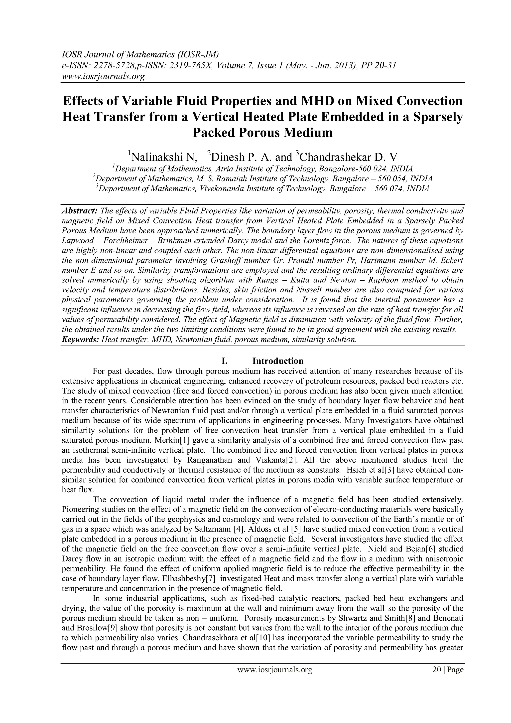 The document investigates mixed convection heat transfer from a vertical heated plate in a sparsely packed porous medium, focusing on the effects of variable fluid properties and magnetic field influence. It employs numerical methods to derive solutions for velocity and temperature distributions, revealing that inertial parameters significantly impact flow fields while inversely affecting heat transfer rates. The findings align with previous studies, confirming the method's accuracy and highlighting the importance of considering variable permeability and porosity in engineering applications.