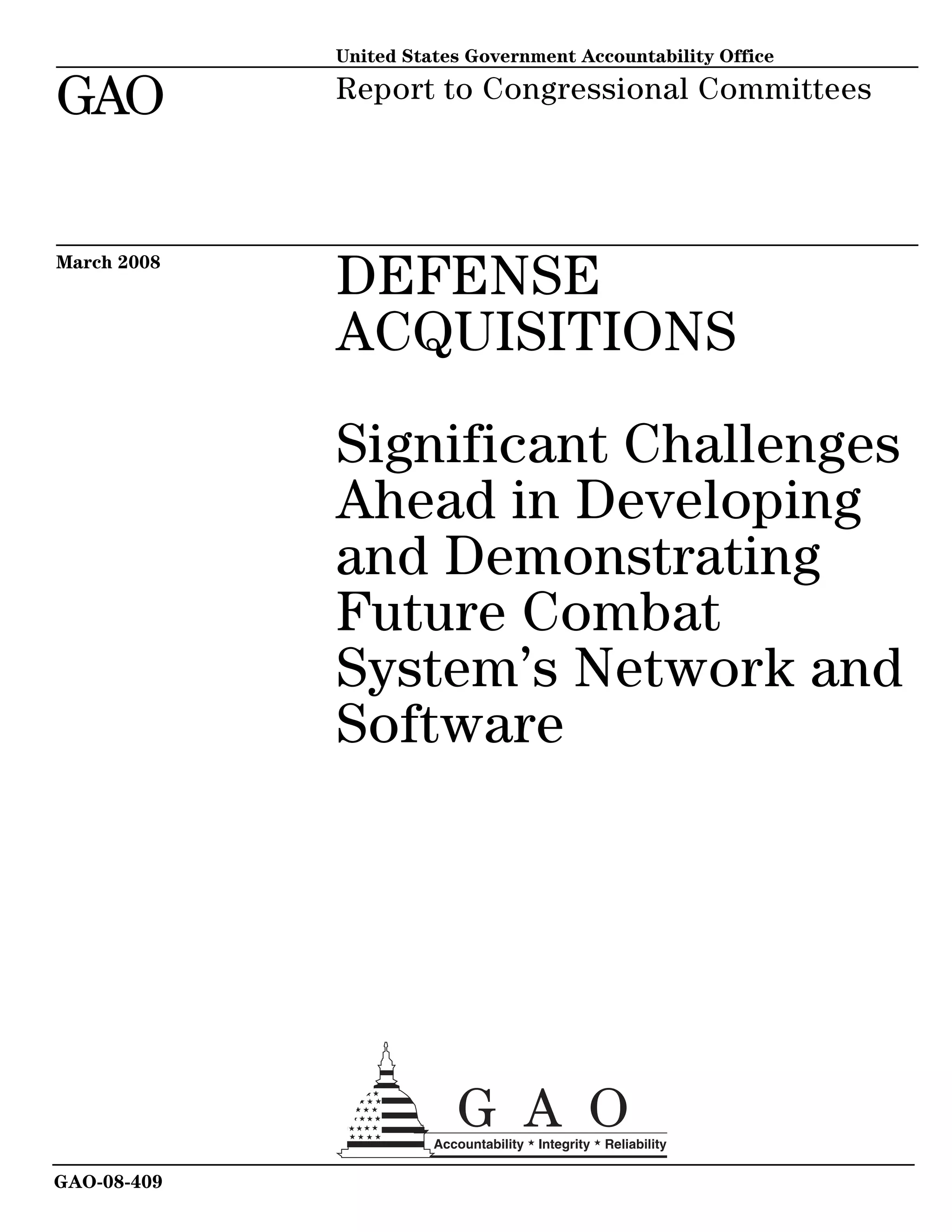The document discusses significant challenges facing the development of the network and software for the Army's Future Combat System (FCS) program. Almost 5 years into the program, it remains unclear if and when the advanced information network at the heart of FCS can be fully developed and demonstrated. Significant risks include an immature network architecture, synchronization with other programs, and the unprecedented size and complexity of the FCS software, which has grown to over 95 million lines of code. While disciplined software practices have been adopted, requirements development has been hampered by schedule pressures and an immature definition of system-level requirements. It is uncertain when the FCS network will be adequately demonstrated, posing risks for designs and assessments at key program mile