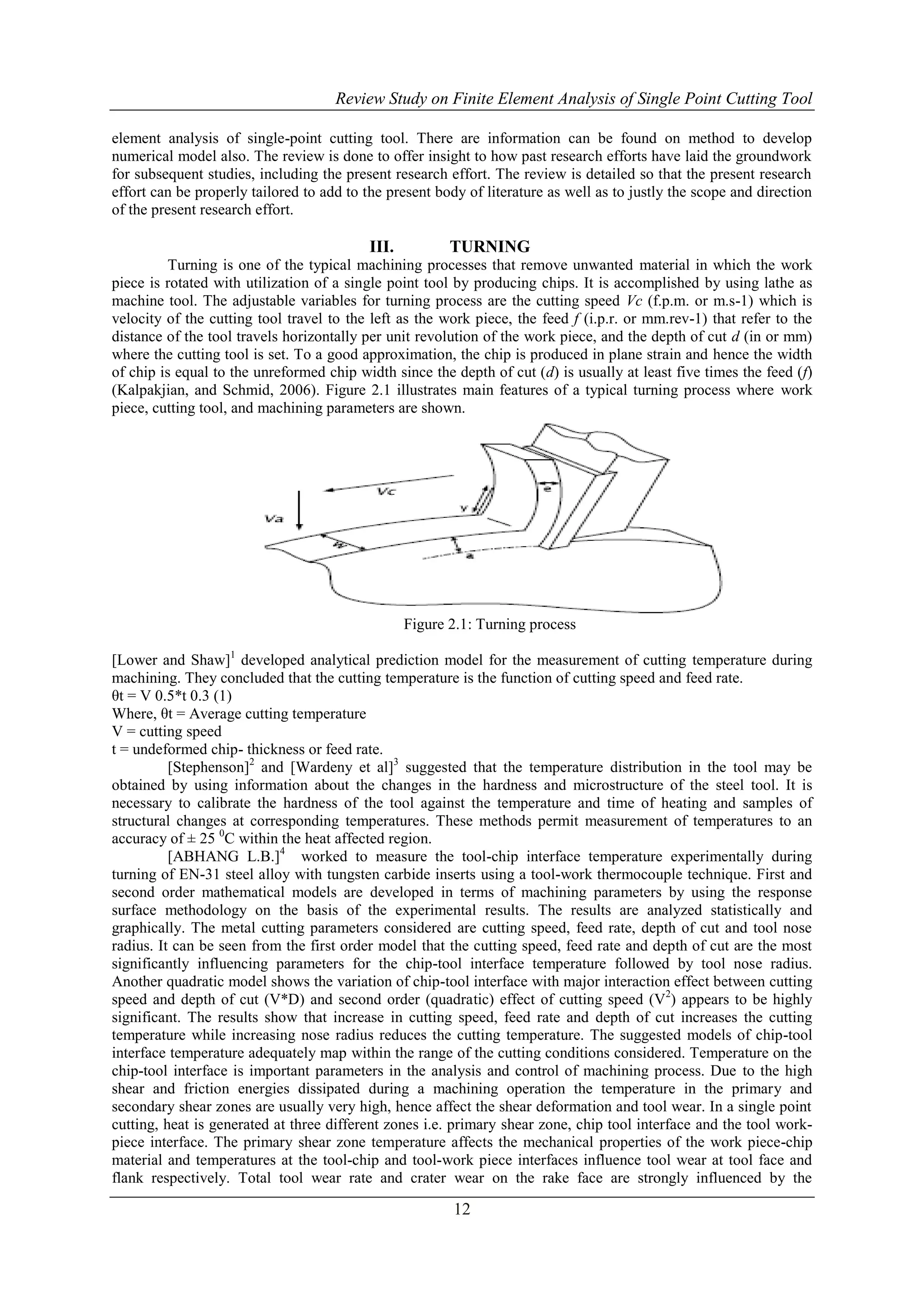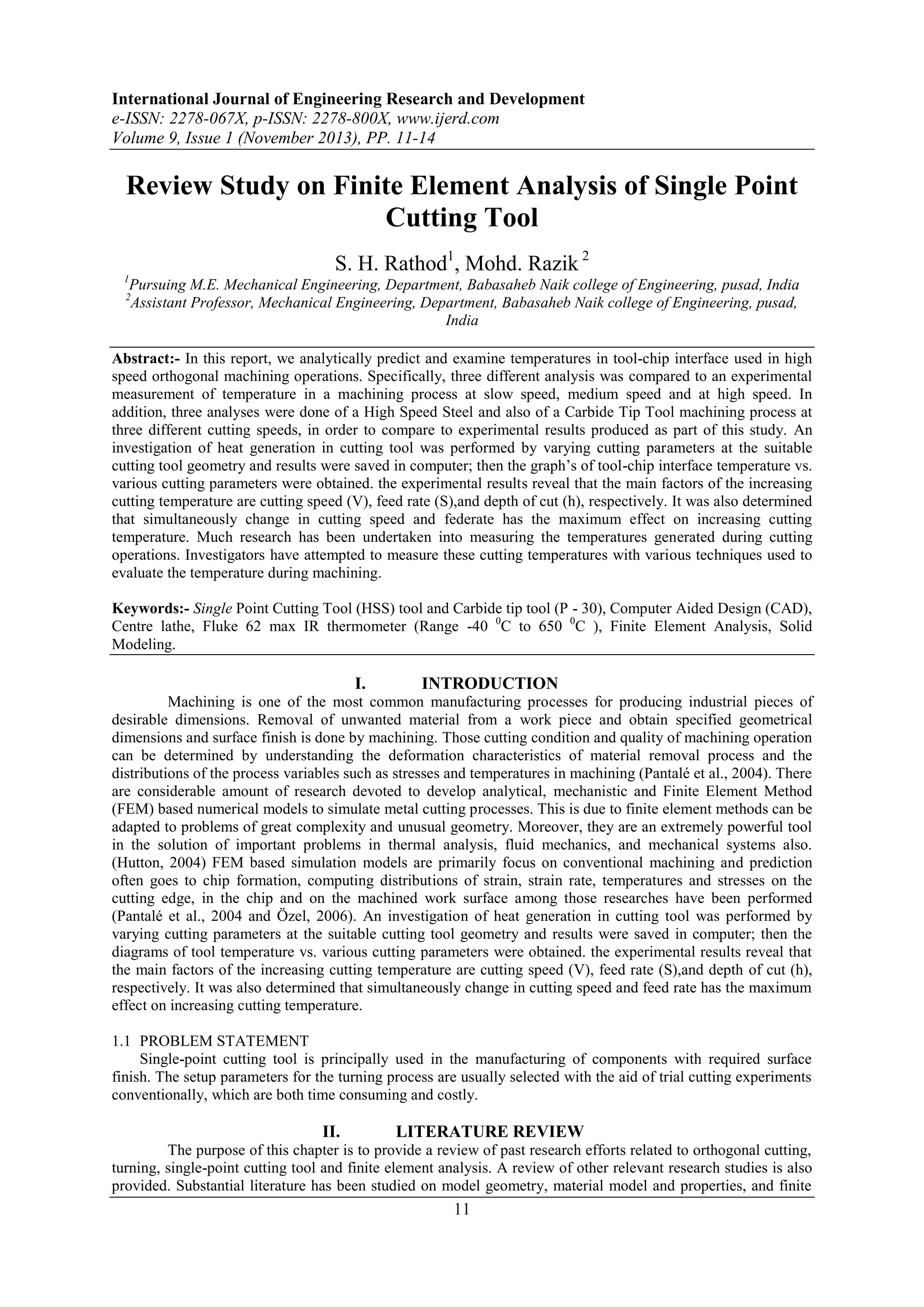 This document presents a review study on the finite element analysis of single-point cutting tools, examining the influence of cutting speed, feed rate, and depth of cut on tool-chip interface temperatures in machining operations. It discusses various analyses and models compared to experimental temperature measurements, highlighting the effectiveness of finite element methods in understanding machining processes. The findings underscore the importance of optimizing cutting parameters to improve machining efficiency and tool longevity.