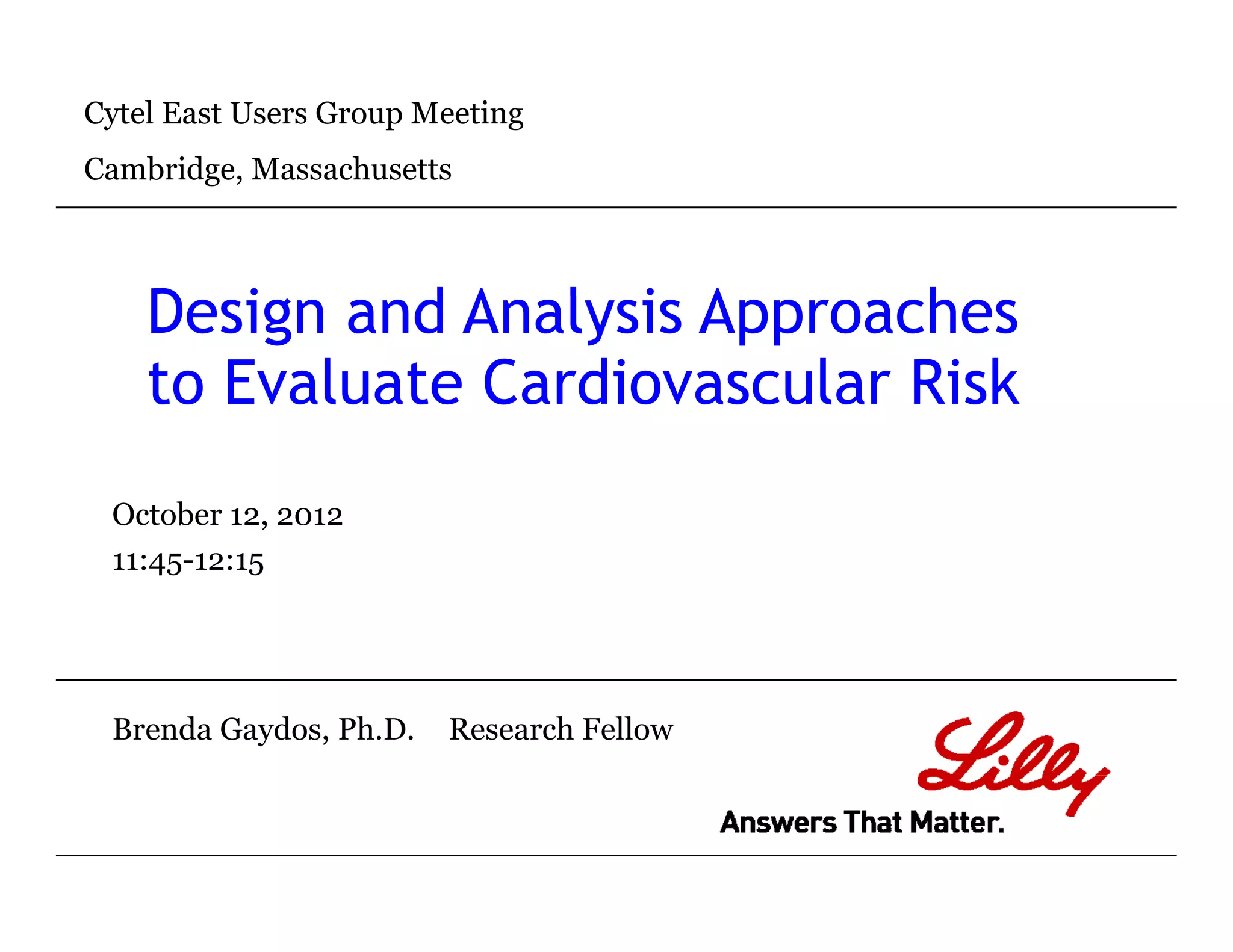 This document summarizes a presentation on approaches to evaluate cardiovascular risk in diabetes drug development. It discusses using meta-analysis and group sequential designs to integrate cardiovascular evaluation into clinical trials and potentially reduce patient exposure. It also compares options like conducting a single large outcome study, two separate cardiovascular outcome trials, or incorporating sub-studies into cardiovascular outcome trials. The presentation emphasizes planning for both non-inferiority and superiority assessments and considering operational aspects like maintaining trial blinding for interim analyses.
