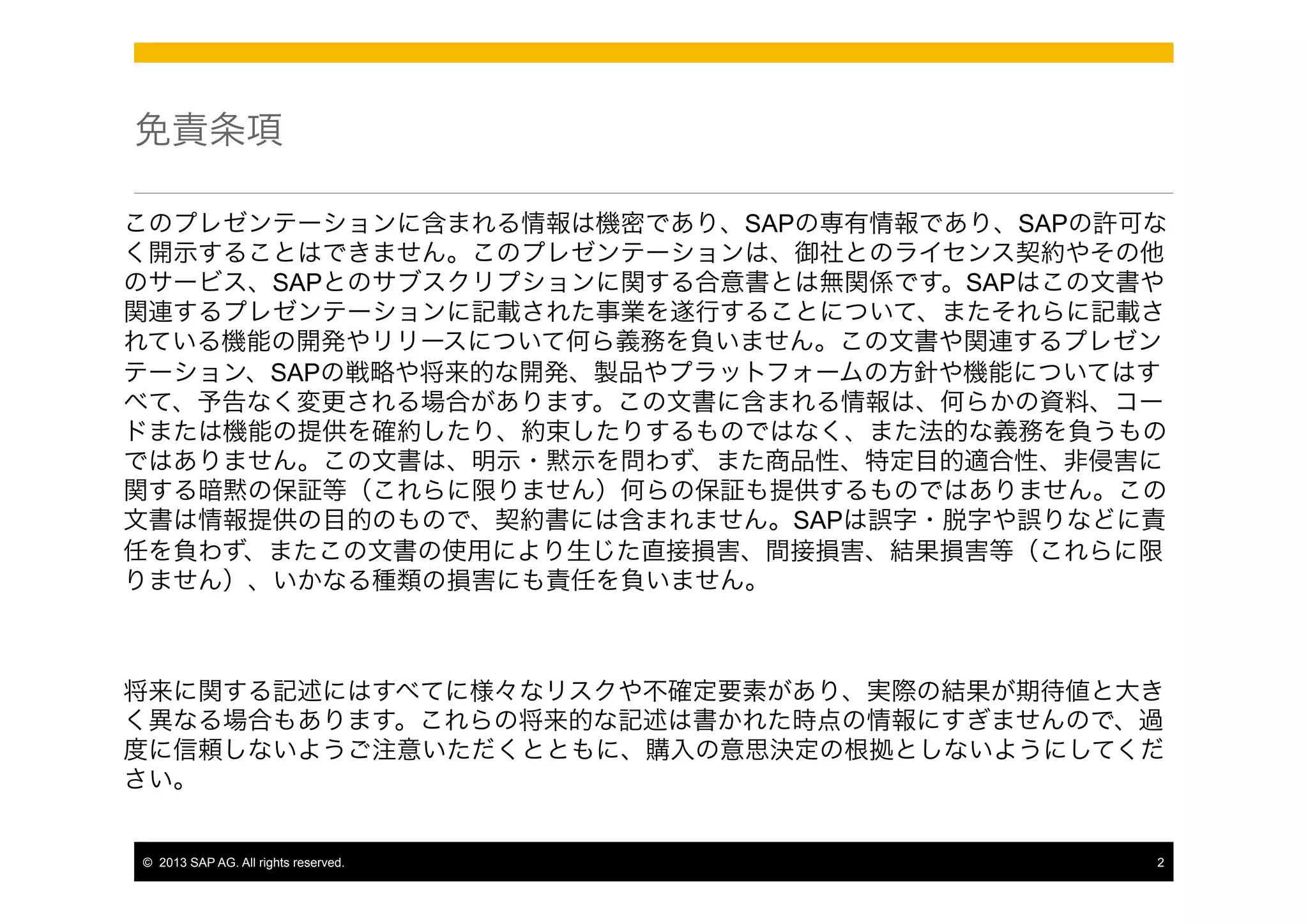 Application Services (SAP HANA XS) SAP HANAプラットフォーム上での迅速なアプリケーション開発とデプロイの ためのネイティブサービス § SAP HANA内のアプリケーションサービス § 迅速なアプリ開発とデプロイ § SAP HANA上で直接実行する軽快なハイパフォーマ ンスアプリへ最適化 § オープンかつ柔軟な開発環境 § JavaScript,SQLScriptおよびHANA Viewベースアプリ の開発環境 § ODATA, JSON, XMLA インターフェース § HTML5 / SAPUI5 およびポータルサービス § HTTP / SMTP による通信 § リポジトリブラウザとプロジェクトエクスプローラーに よるチーム開発のためのコラボレーション環境 § アプリケーションエコシステムの最小化 § アプリのデプロイのための“レイヤ”最小化による TCO削減 § SAP HANA上で直接動作 © 2013 SAP AG. All rights reserved. 31