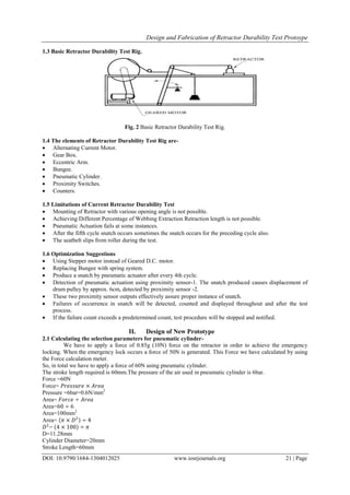 This document describes the design and fabrication of a prototype for testing the durability of seat belt retractors. The current testing machine has limitations like not being able to test retractors at different mounting angles and extract/retract lengths. The new prototype aims to address these using a stepper motor, spring system instead of bungee, and sensors to detect the snatch produced every 4 cycles. It involves calculations to select components like the pneumatic cylinder, FRL unit, spring, and shaft based on the required forces, strokes and flows. A 3D model was developed and simulations conducted to validate the design. The physical prototype was then fabricated to cater to increasing demand for seat belt testing.