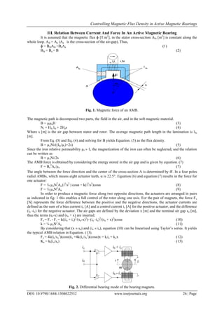 This document discusses controlling magnetic flux density in active magnetic bearings. It describes how active magnetic bearings use electromagnets and feedback control loops to levitate and stabilize a rotating shaft without physical contact. Various sensor types are discussed for measuring the displacement of the levitated rotor, including inductive, eddy current, and capacitive sensors. The relationship between actuator current and magnetic force is explained, showing how current controls the flux density and resulting forces in the bearing.