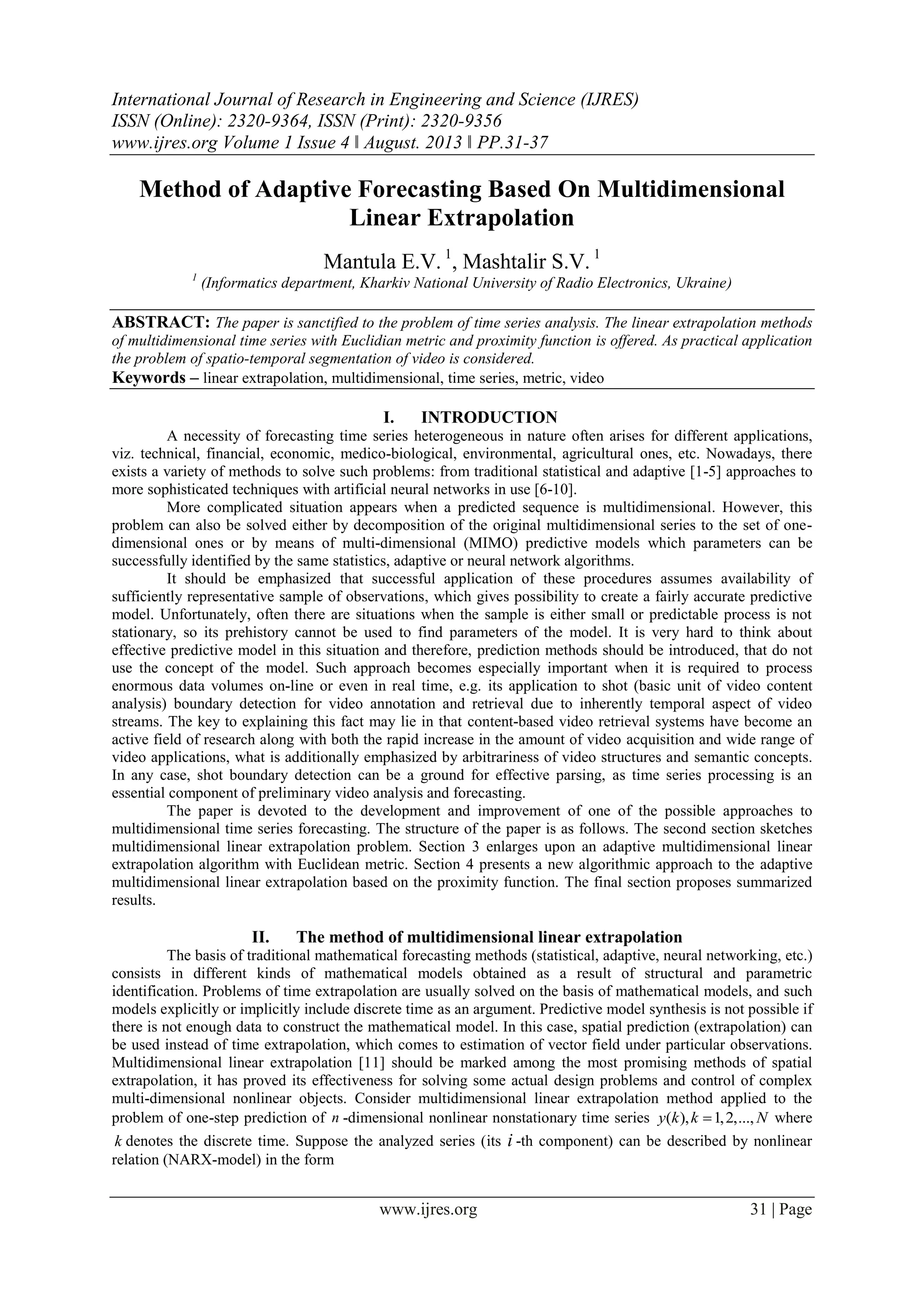 The document discusses a method for adaptive forecasting based on multidimensional linear extrapolation, specifically aimed at time series analysis. It presents an algorithm that addresses challenges when dealing with nonstationary and multidimensional data to enhance prediction accuracy, particularly in applications like video content analysis. The paper details a new adaptive approach utilizing proximity functions, which optimizes the prediction process in real-time scenarios.