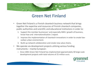 The document summarizes a project called "Central Baltic Cleantech Clusters expanding to East of EU markets (CB2East)" that aims to facilitate new business cooperation in cleantech between Finland, Latvia, Russia, and Central Asia. The project is funded by the EU and coordinated by Green Net Finland, Finnish Water Forum, and Cleantech Latvia. It seeks to connect cleantech companies to opportunities in areas like energy efficiency, smart water technologies, and developing new value chains and solutions tailored for target markets.