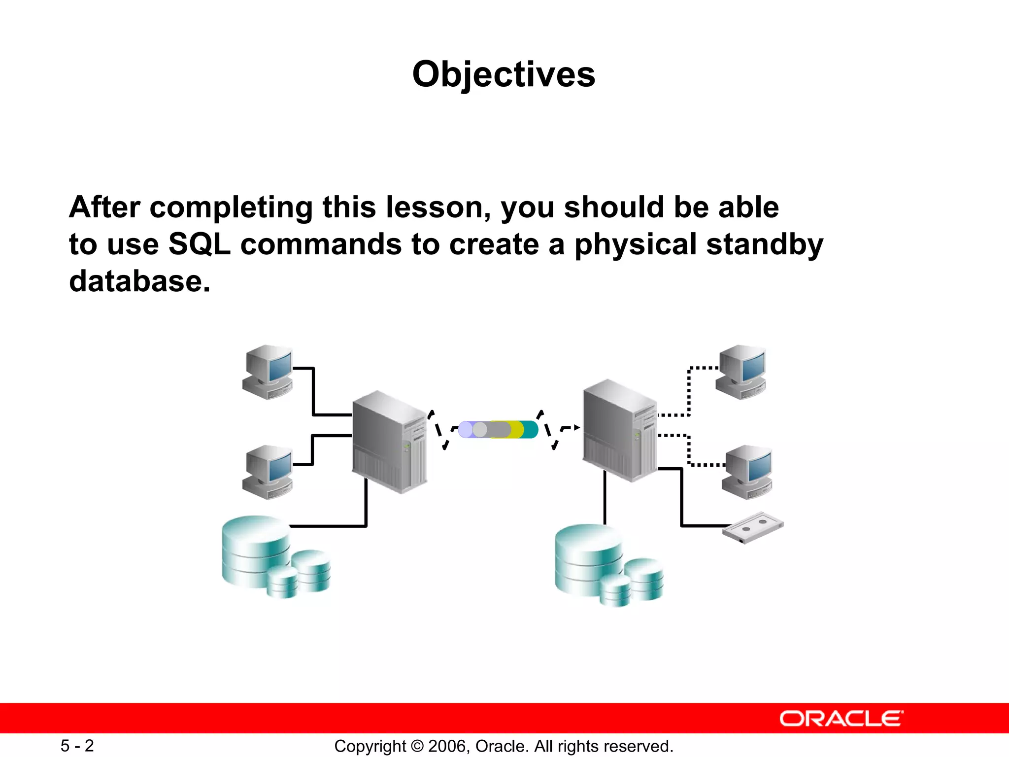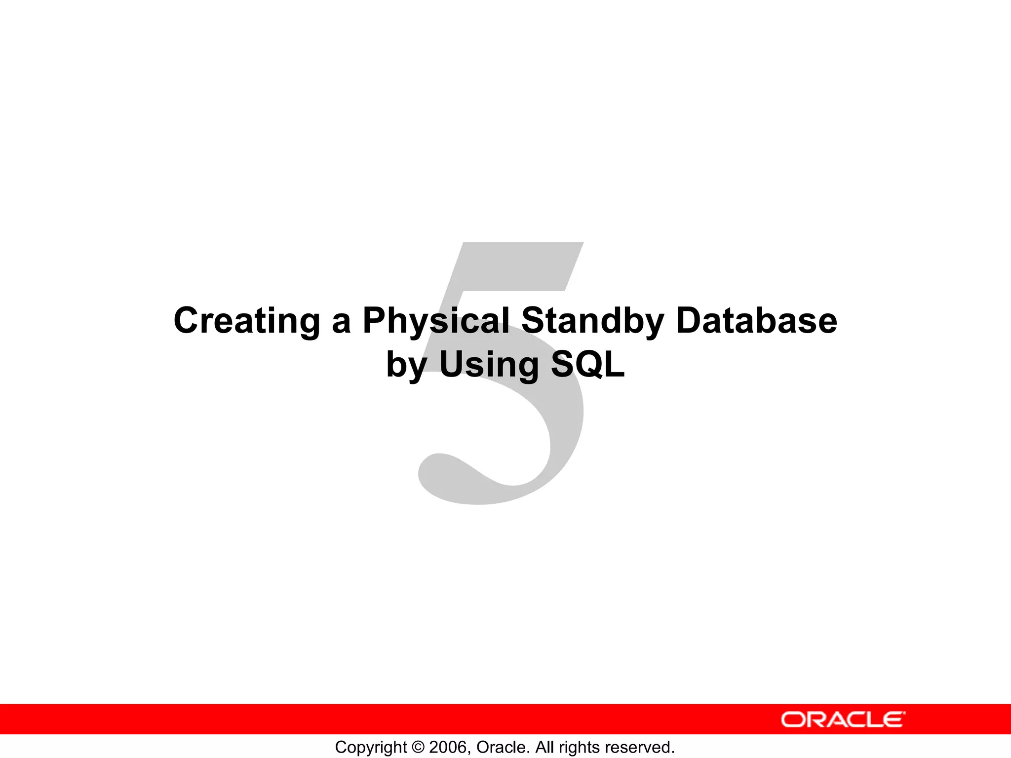 The document describes the steps to create a physical standby database using SQL commands: