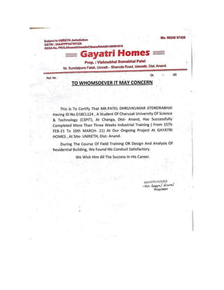 The document discusses the analysis and design of a residential building project submitted by Patel Dhruv Jitendrabhai for their Bachelor of Technology degree. It includes details of the construction process from excavation and foundation work to slab work and services. The report covers the design of key structural elements like beams, columns, slab, and staircase according to Indian standard codes.