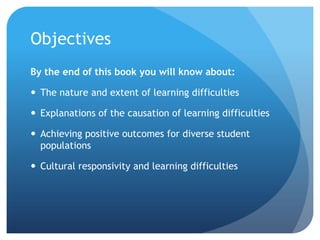 This document discusses learning difficulties, their causes, and achieving positive outcomes for diverse students. It covers several key points: