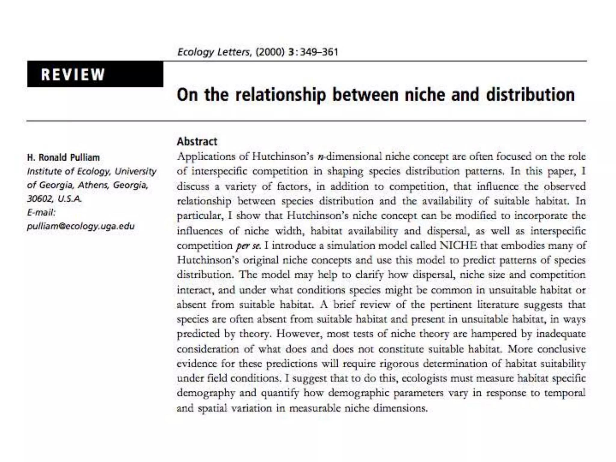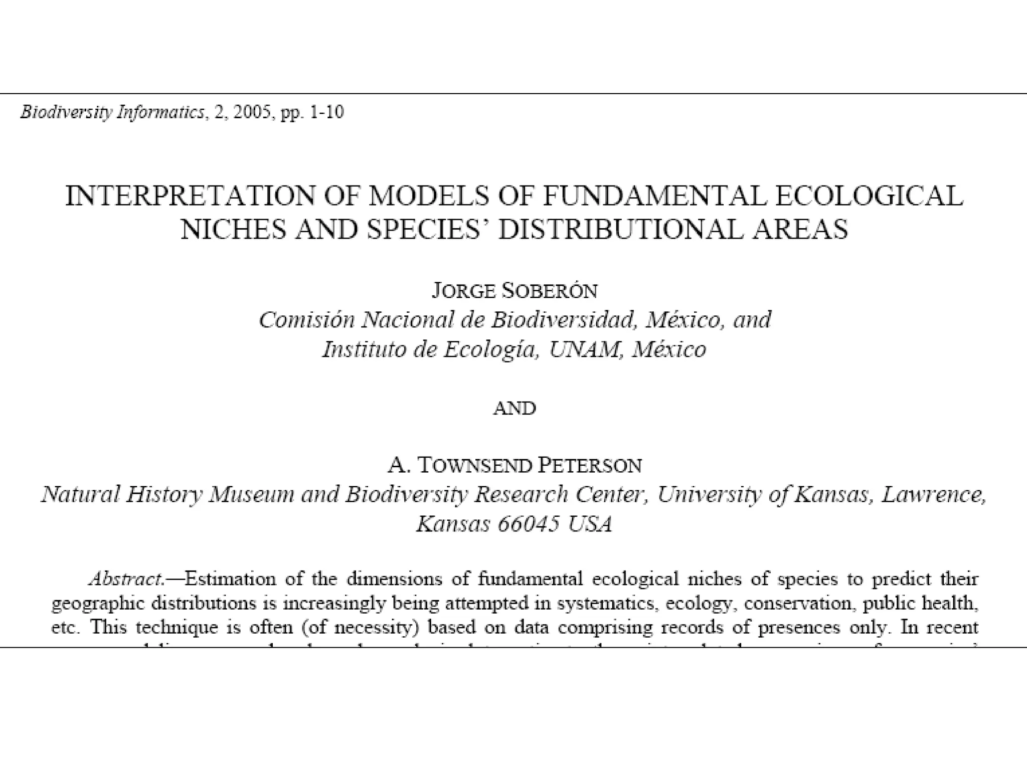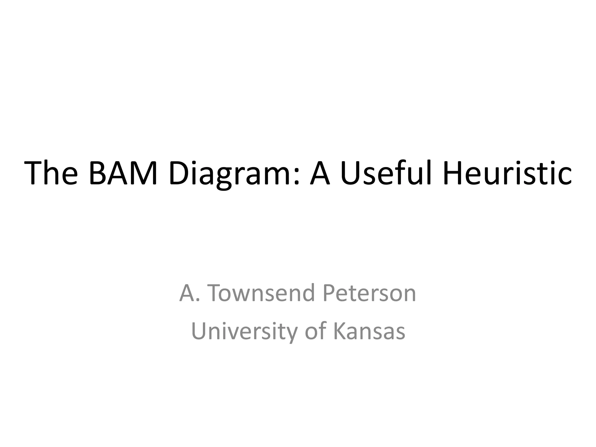 The document discusses the BAM (Biotic, Abiotic, Movement) diagram, which is a heuristic for conceptualizing species' ecological niches and geographic distributions. It describes the three components of the BAM diagram - the abiotic niche defined by physiological requirements, the biotic niche defined by biotic interactions, and accessibility defined by a species' ability to disperse. The document also discusses Hutchinson's distinction between scenopoetic and bionomic variables and provides examples demonstrating the importance of dispersal limitations on species' distributions.
