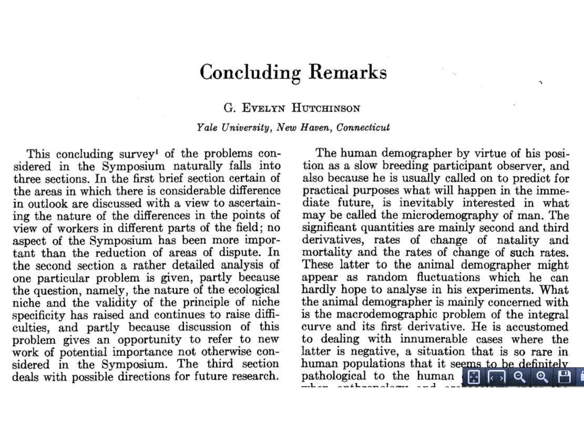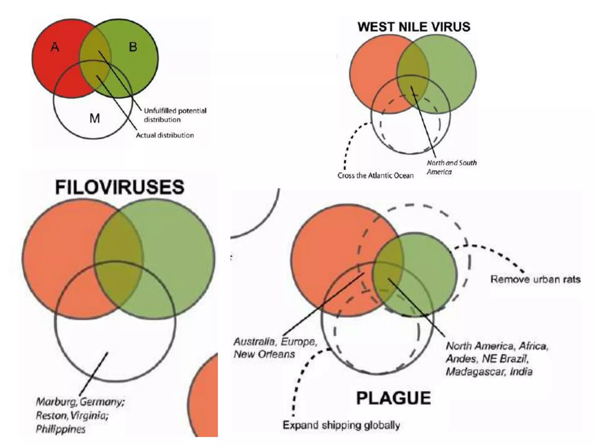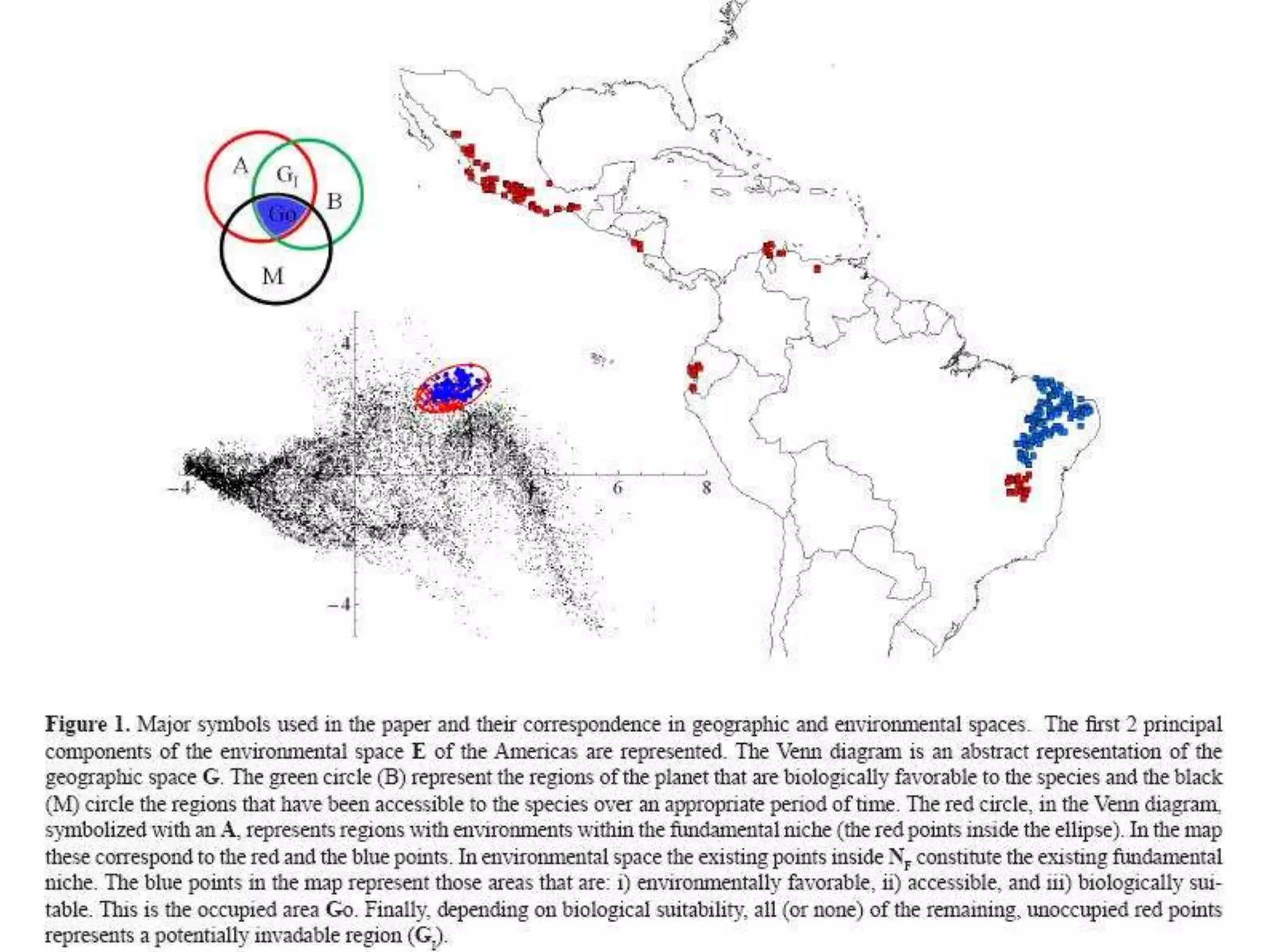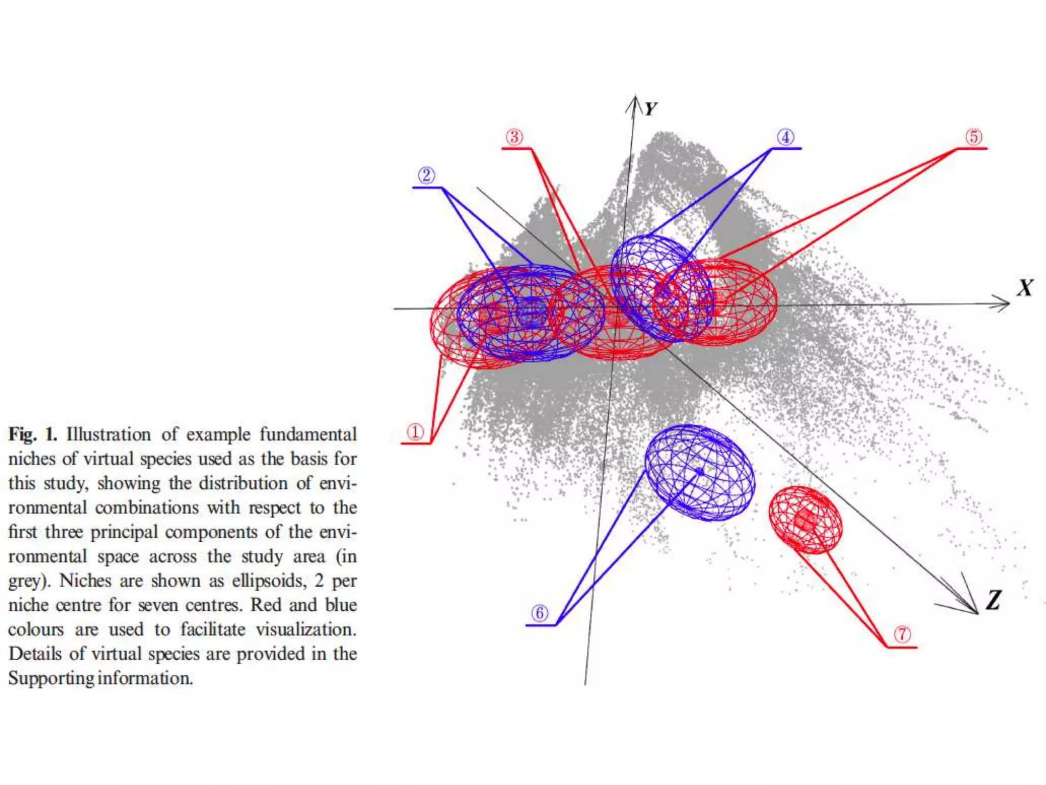 The document discusses the BAM (Biotic, Abiotic, Movement) diagram, which is a heuristic for conceptualizing species' ecological niches and geographic distributions. It describes the three components of the BAM diagram - the abiotic niche defined by physiological requirements, the biotic niche defined by biotic interactions, and accessibility defined by a species' ability to disperse. The document also discusses Hutchinson's distinction between scenopoetic and bionomic variables and provides examples demonstrating the importance of dispersal limitations on species' distributions.