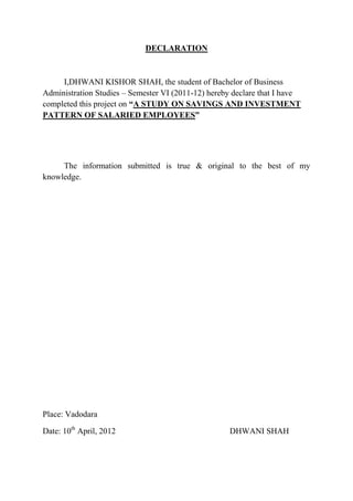 The document is a project report submitted by Dhwani Kishor Shah to The Maharaja Sayajirao University in Vadodara, Gujarat, India. The report examines the savings and investment patterns of salaried employees. It includes sections on the introduction, objectives, rationale, limitations, research methodology, concepts of savings and investment, characteristics of investment, need and types of investment, industry profile, data and interpretation, summary and conclusions, and an attached questionnaire. The overall aim is to analyze how salaried employees in India save and invest their money.