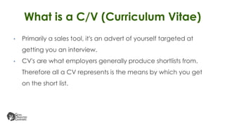 The document provides guidance on writing an effective curriculum vitae or resume, noting that the goal is to convey the major points that make the applicant employable and get them an interview, and the CV should be targeted to the specific job being applied for by emphasizing the relevant skills, experience, and qualifications. It offers tips on the typical sections to include in a CV like work experience, education, skills, and references, as well as formatting and presentation best practices to make the CV brief and visually impactful.