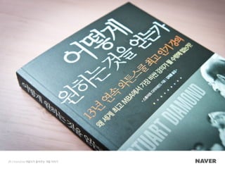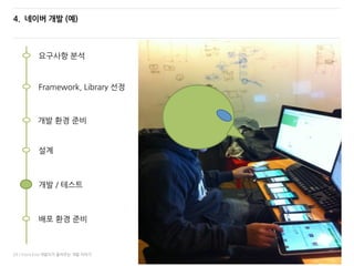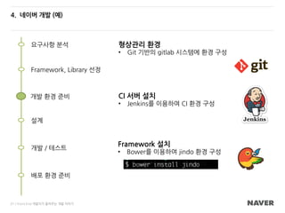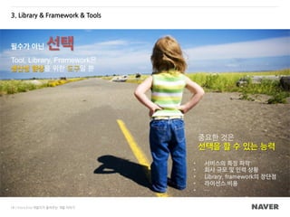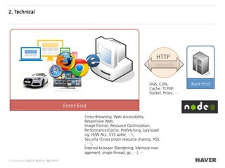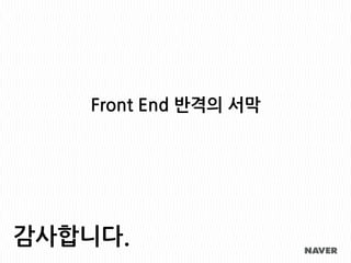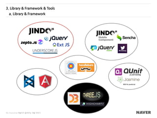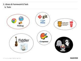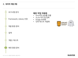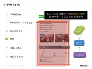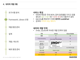 The document discusses the story of a front-end developer at Naver. It describes how front-end development has evolved from a time when network, applications, servers, and software resources were duplicated across different platforms to modern approaches where resources can be shared and reused through common components and frameworks. The developer promotes using Jindo Mobile Component for easy and fast development of mobile web user interfaces at Naver.