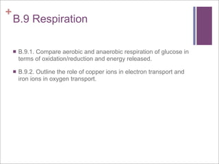The document compares aerobic and anaerobic respiration, outlining their shared characteristics as well as their differences in efficiency and ATP production. It also discusses the roles of copper and iron ions in electron transport and oxygen transport during respiration. Additionally, it explains how excess acidity in the stomach can be reduced through the use of bases like aluminum hydroxide, magnesium hydroxide, magnesium carbonate, and sodium bicarbonate in antacids. These bases neutralize stomach acid through neutralization reactions.