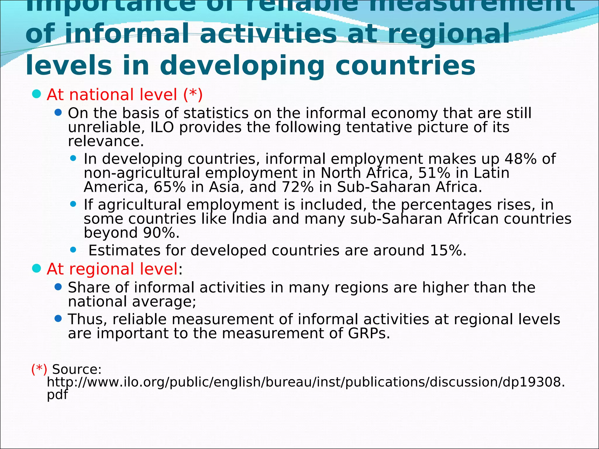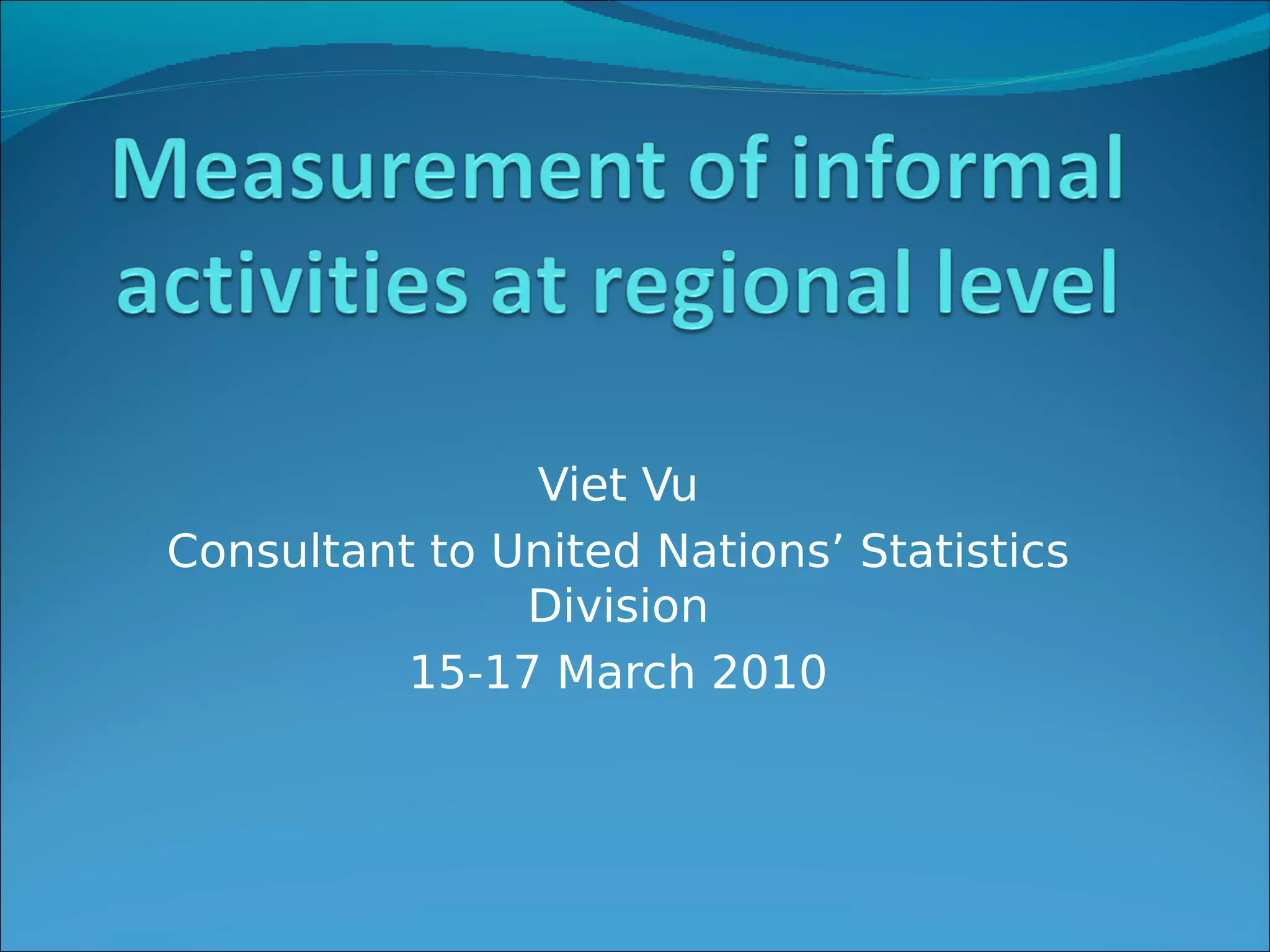 The document discusses methods for measuring informal economic activities at regional levels in developing countries. It proposes using a 1-2 survey approach combining a labor force survey to identify household enterprises (HUEMs) followed by a survey of those HUEMs. An alternative is a full household survey. For quarterly estimates, employment data from labor force surveys could be extrapolated using productivity adjustments compared to formal businesses. Reliable regional measurement of informal activities is important for gross regional product estimates.