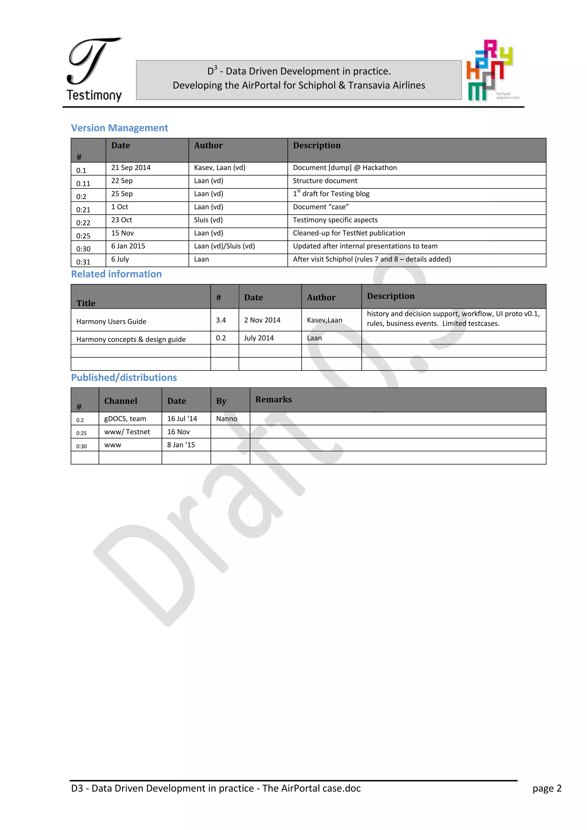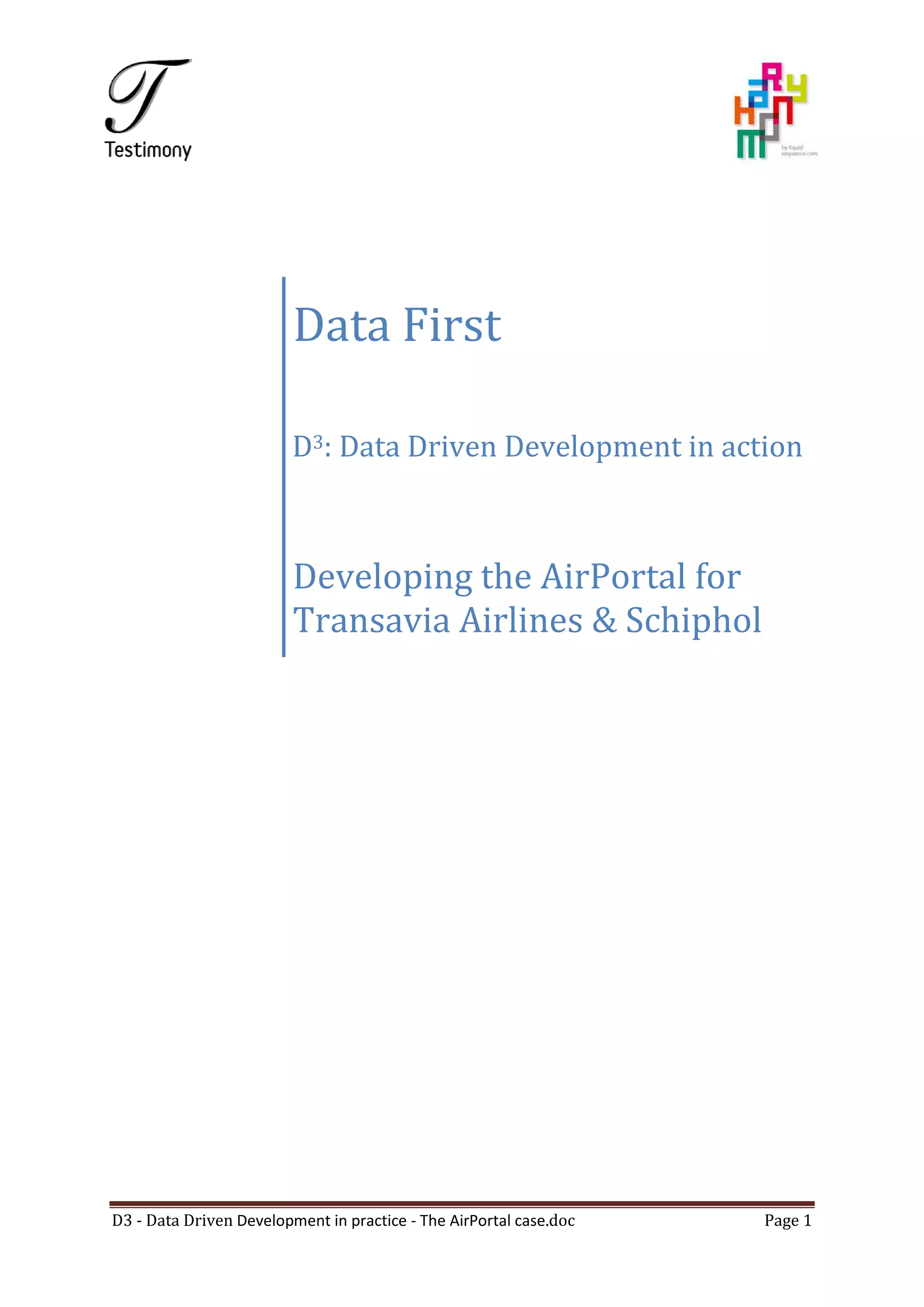 The document describes developing a new online booking system called the AirPortal for Transavia Airlines and Schiphol Airport using a Data Driven Development (D3) approach. Key aspects of the D3 approach included defining test cases using spreadsheets with input, expectation, and output sections. These test cases served as the specification for developing the AirPortal application using the Harmony and Testimony platforms. The AirPortal was successfully developed during a hackathon to address Transavia's needs for a more flexible booking system.