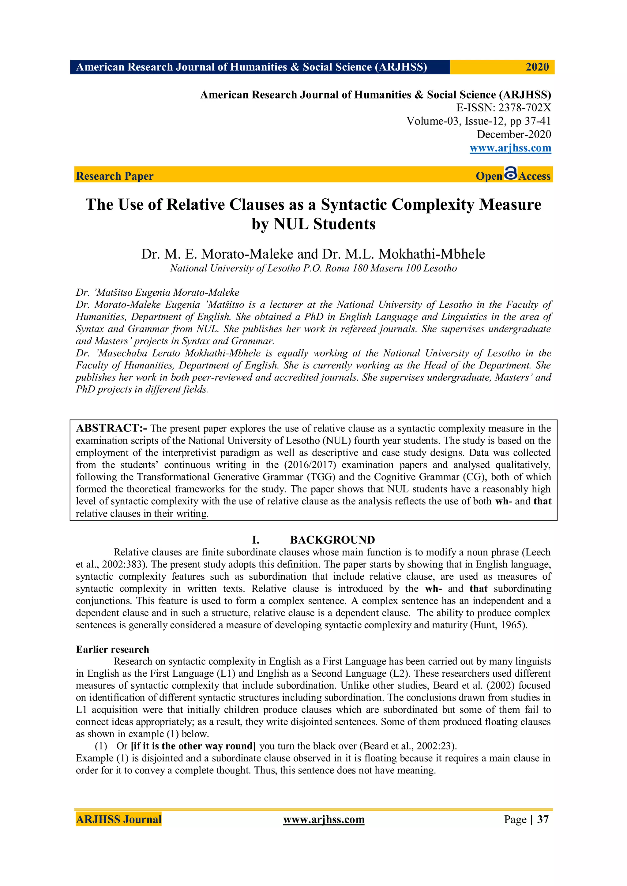 This research paper investigates the use of relative clauses as a measure of syntactic complexity in the examination scripts of fourth year students at the National University of Lesotho. It reveals that these students exhibit a high level of syntactic complexity in their writing, effectively employing relative clauses in various syntactic positions. The findings suggest that the students are capable of constructing complex sentences using restrictive relative clauses, enhancing the clarity and specificity of their writing.