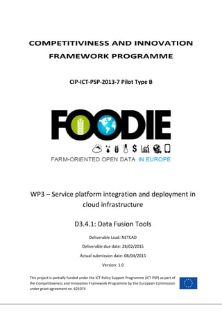 This document introduces the first prototype of data fusion tools being developed as part of the FOODIE project. The tools combine data from different sources to provide a more efficient representation. They associate textual and spatial data from various structures and sources. A Netcad WPS implementation provides data fusion processes that analyze multiple image sources via workflows. The services are accessible online and development is ongoing to include additional fusion capabilities.