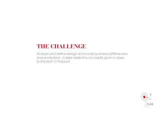 The document discusses applying design concepts to the BoP 2 protocol. It analyzes the similarities and differences between design and social business. It presents the BoP pyramid framework which outlines the phases and concepts of a social business project. These include building deep dialogue, collective entrepreneurship development, and new capability development. Design is seen as a fundamental part of the entire process. The document concludes that concepts like change, co-creation, and learning from failure are transversal to both design and social business. It recommends further analysis and testing of the BoP protocol to identify strengths and weaknesses.