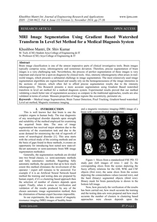 This document summarizes a research paper on segmenting MRI brain images using a gradient-based watershed transform within a level set method. The paper begins with an introduction on the importance of accurate brain image segmentation for medical diagnosis. It then reviews existing segmentation methods and their limitations. The proposed method uses a two-level gradient watershed transform combined with morphological operations within a level set framework to segment brain images. Experimental results showed this approach achieved better segmentation accuracy than traditional methods.