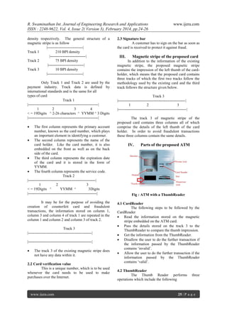 This document presents a research article proposing techniques to eliminate unauthorized and fraudulent ATM transactions through the use of image processing and thumbprint recognition. It suggests attaching a thumbreader to ATMs to compare left-thumb impressions with those embedded on magnetic stripe cards, enhancing security beyond current magnetic stripe technology. The proposed advancements aim to significantly reduce ATM fraud while maintaining reliance on existing technologies.