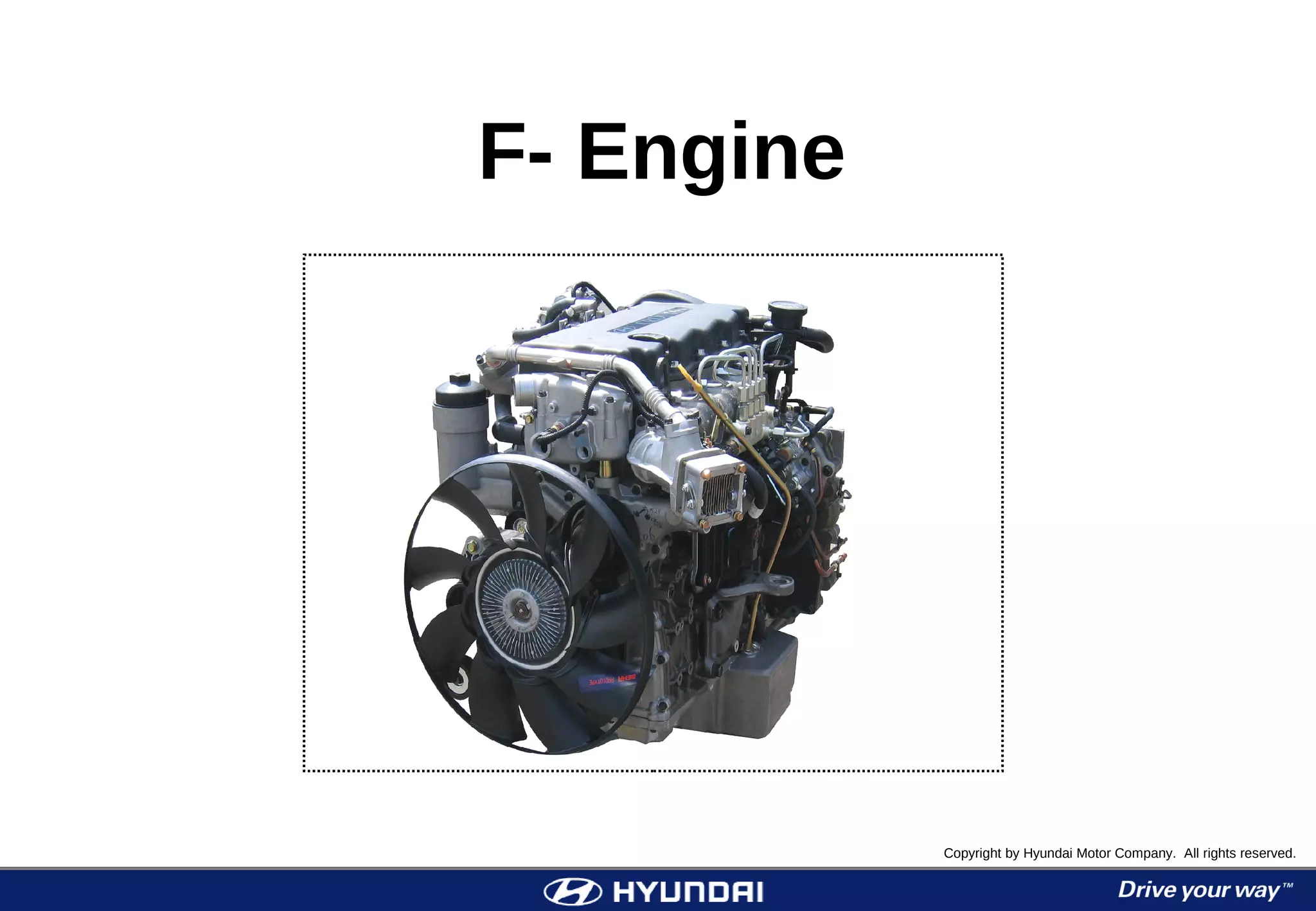 This document provides technical specifications and descriptions for the F-engine from Hyundai Motor Company. It includes details on displacement, bore/stroke, cylinder type, compression ratio, power/torque output, weight, materials, valves, fuel injection system, and more. Diagrams and descriptions are provided for various engine systems like the timing systems, oil filter/cooler, EGR system, fuel injection, PMC, sensors, and more. Removal and installation procedures are outlined for components like the fuel supply pump. Parameter settings for the ECT are also discussed.