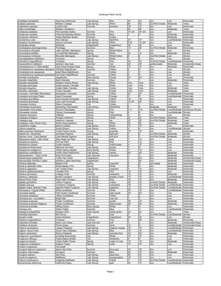 The document is an Excel spreadsheet listing plants suitable for xeriscaping. It includes the Latin and common names of each plant, along with information on their bloom time, color, height, sunlight and water requirements, and whether they are trees, shrubs, perennials, etc. There are over 100 different plant varieties listed with their key characteristics.