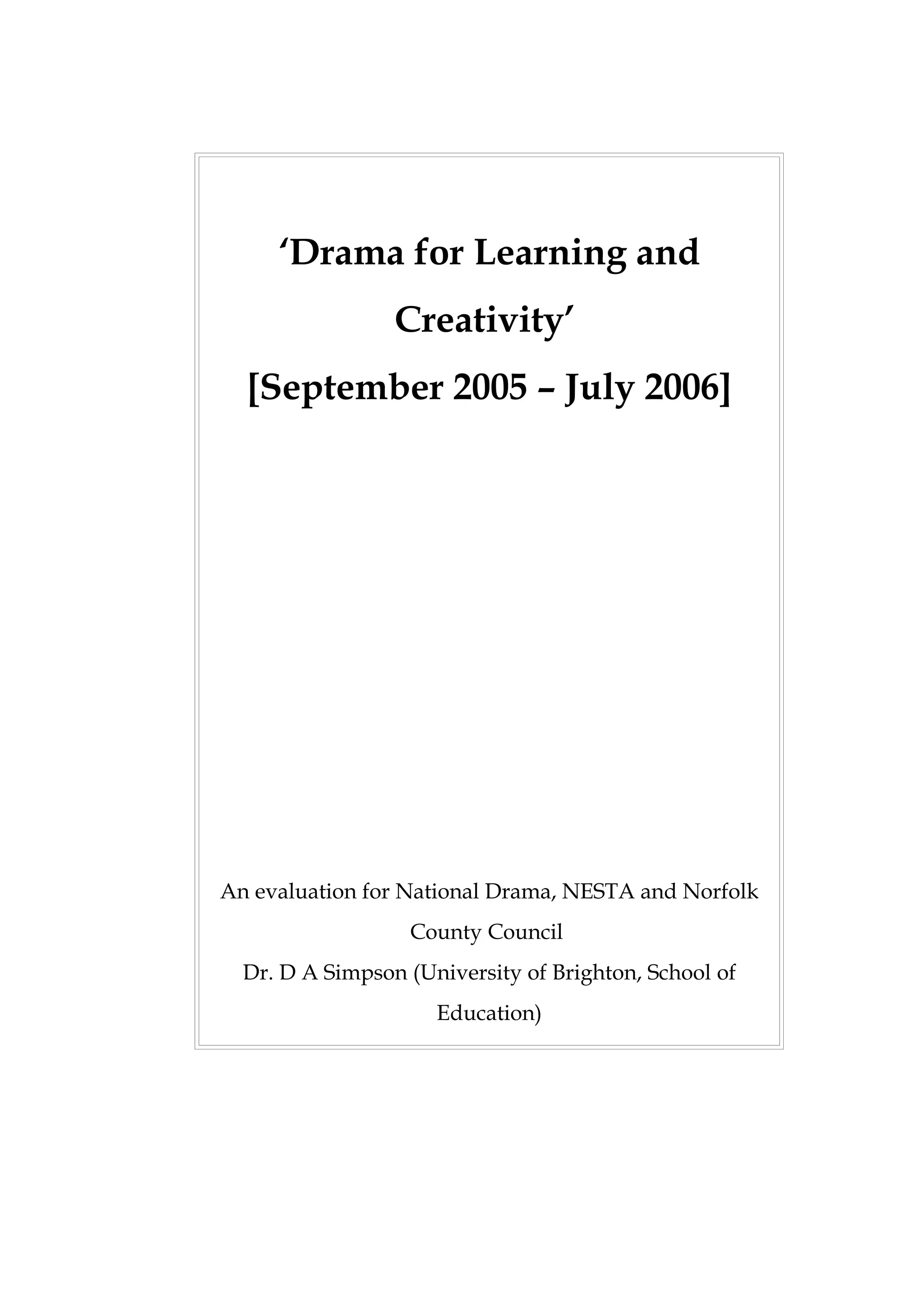 The 'Drama for Learning and Creativity' project, evaluated from September 2005 to July 2006, successfully engaged teachers and consultants in utilizing whole class drama to enhance children's learning and creativity across 60 Norfolk schools. The project demonstrated measurable increases in teachers’ confidence in teaching drama and a significant rise in the integration of drama into school curricula, with 100% of participating schools incorporating drama into their improvement plans. The findings also indicate that drama positively impacts students’ cognitive and emotional engagement with learning, underlining the necessity to elevate the profile of drama in education.