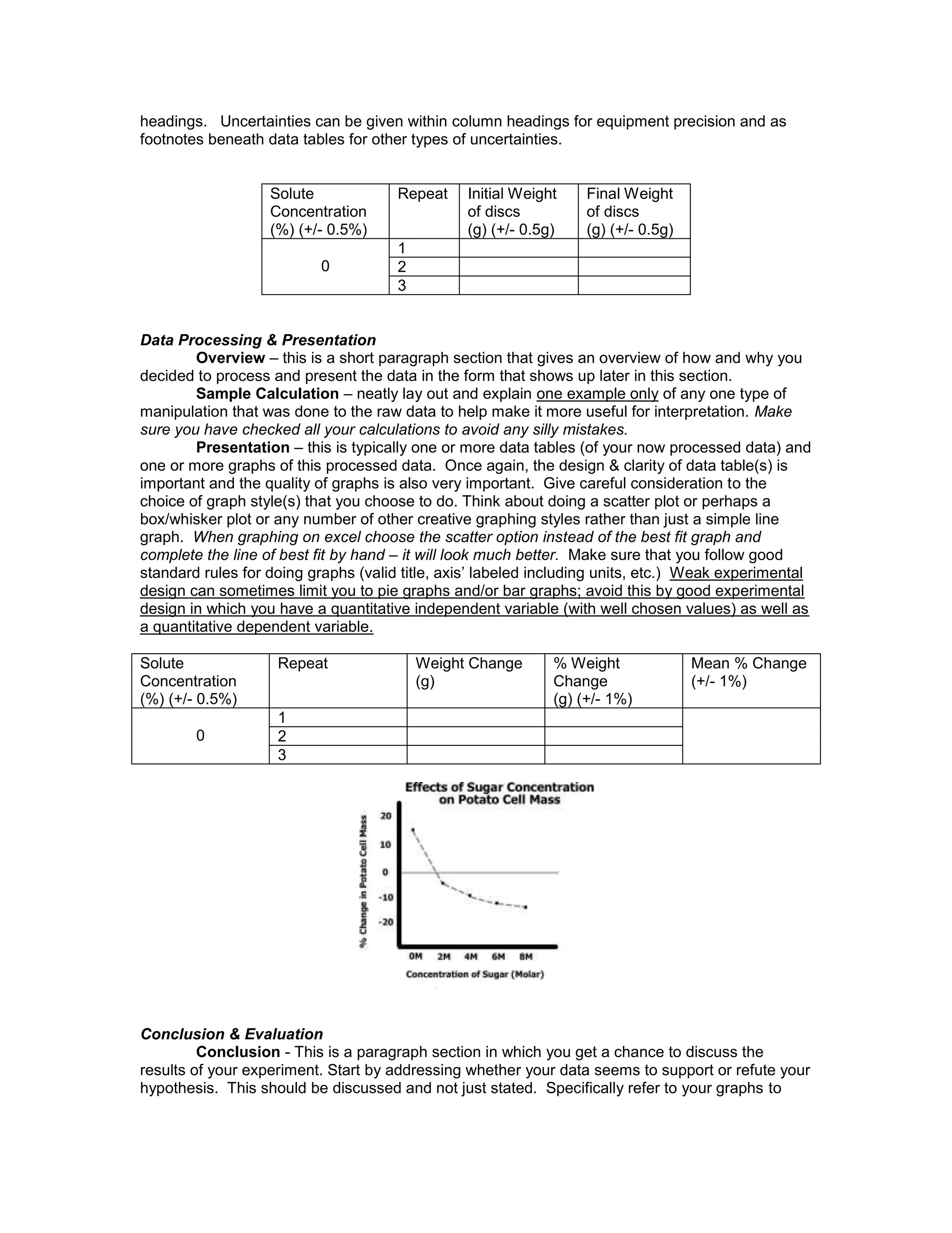 This document outlines the required format and sections for an IB Biology internal assessment lab report. It provides detailed instructions on how to structure each section, including Planning, Data Collection, Data Processing and Presentation, and Conclusion & Evaluation. Key requirements include focusing the question, stating a clear hypothesis with rationale, controlling variables, collecting sufficient raw data, processing and graphing data appropriately, discussing whether results support the hypothesis, and evaluating limitations and ways to improve the experimental design.