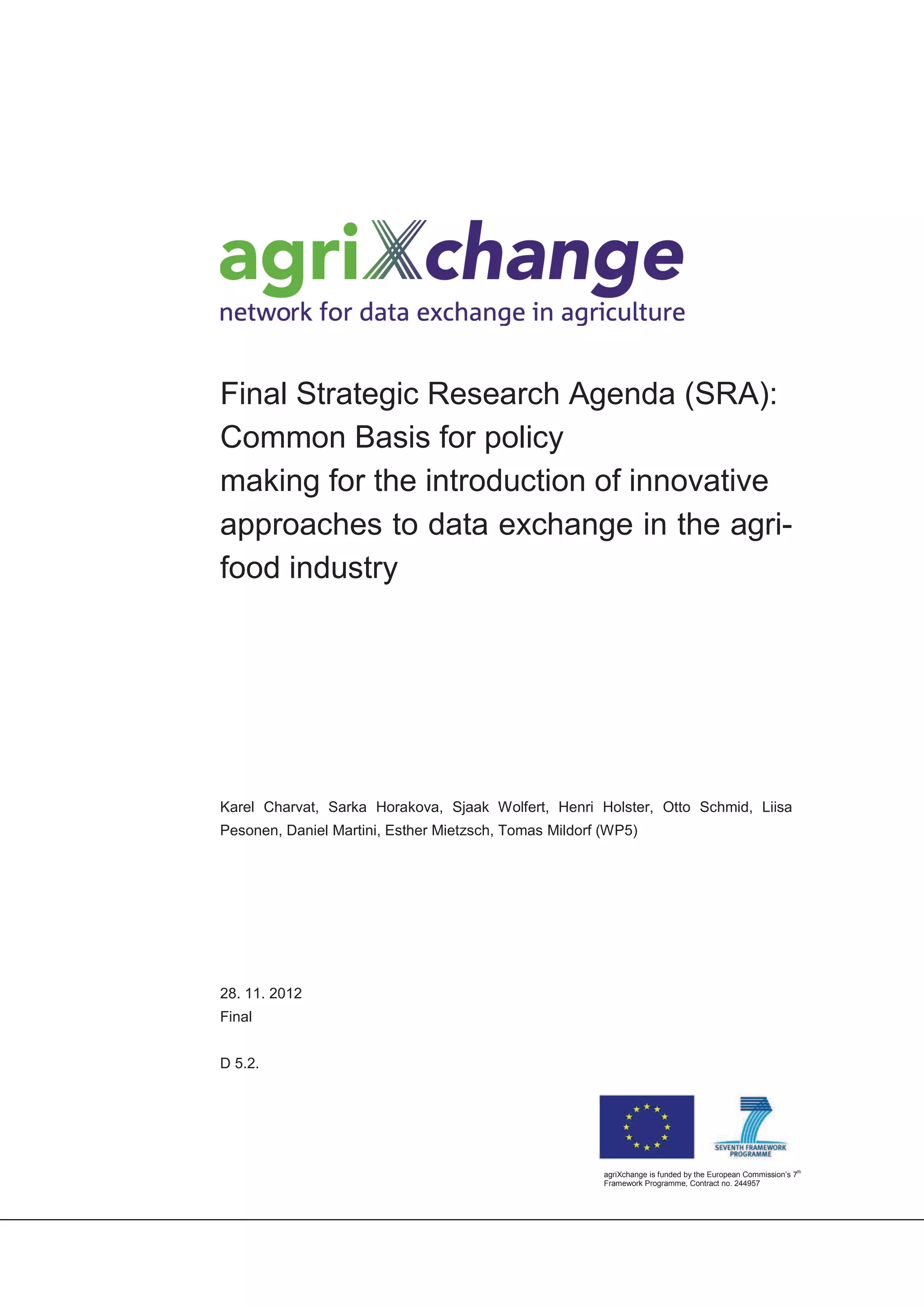The document provides a strategic research agenda (SRA) for standardization related to data exchange in the agricultural sector. It analyzes past initiatives and current standardization efforts. Key findings include the need for improved interoperability and data sharing enabled by standards. It also cites challenges like a lack of long-term sustainability in ICT research for agriculture. The SRA aims to identify challenges and help guide future work on standardization to better support data-driven innovation and technology adoption in agriculture.