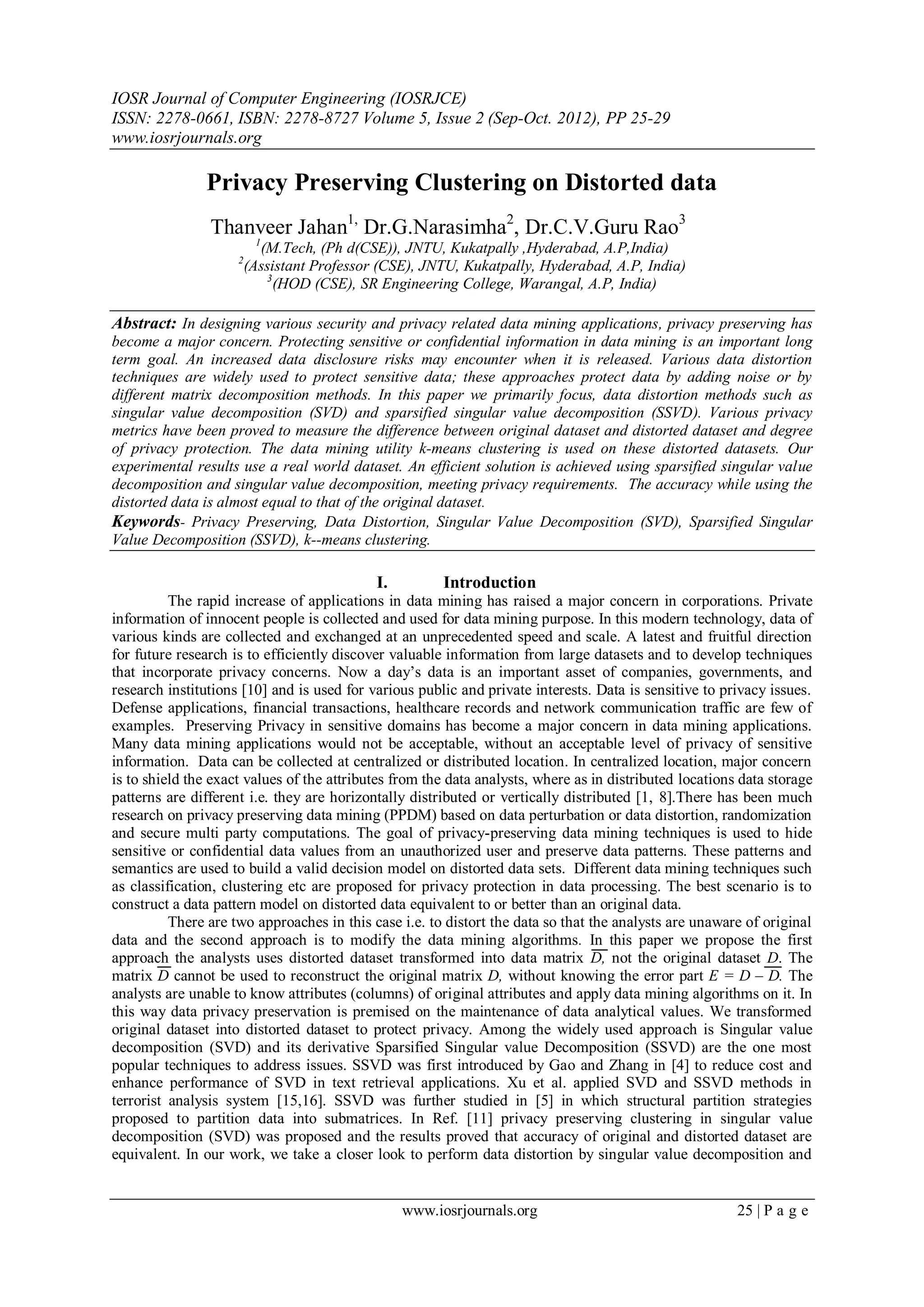 - The document discusses privacy-preserving clustering on distorted data using singular value decomposition (SVD) and sparsified singular value decomposition (SSVD).