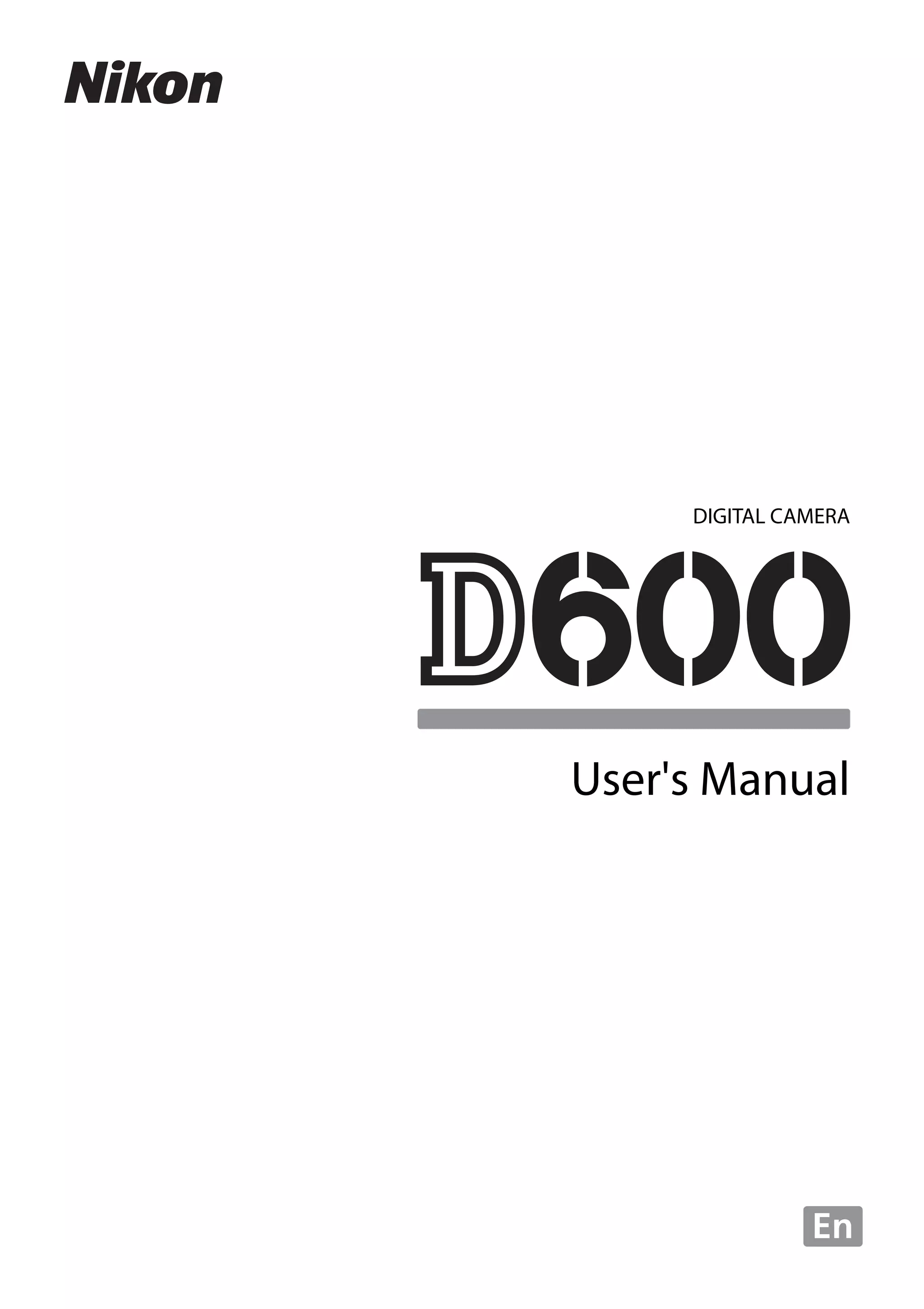 The document is the user manual for a Nikon D600 digital SLR camera. It provides instructions on basic camera operation, modes, menus, connections, maintenance and more. Key sections include an introduction, chapters on shooting modes, playback, retouching photos, custom settings menus, and connections. Symbols are used to mark important information and references to other pages. Camera settings assume default options are used.