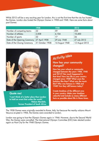 The document provides information about the Olympic Games hosted in London in 1908, 1948, and 2012. It includes facts about the number of competing teams and athletes, sports, and dates. It discusses how London was originally awarded the 1908 Games but had to be moved from Rome due to Mount Vesuvius erupting. London would go on to host the Games again in 1948 after they were cancelled in 1944 due to World War 2. The document encourages activities comparing how the Games and sports have changed over the years in areas like equipment, rules, and advertising.