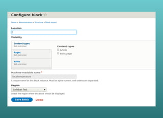 2. Making the block configurable by adding a configuration form to set the city, and saving it in the block settings.