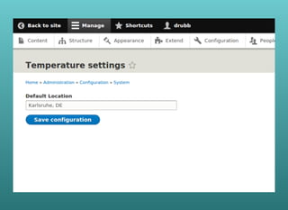 This document describes the steps to create a configurable temperature display block module for Drupal 8. It involves: