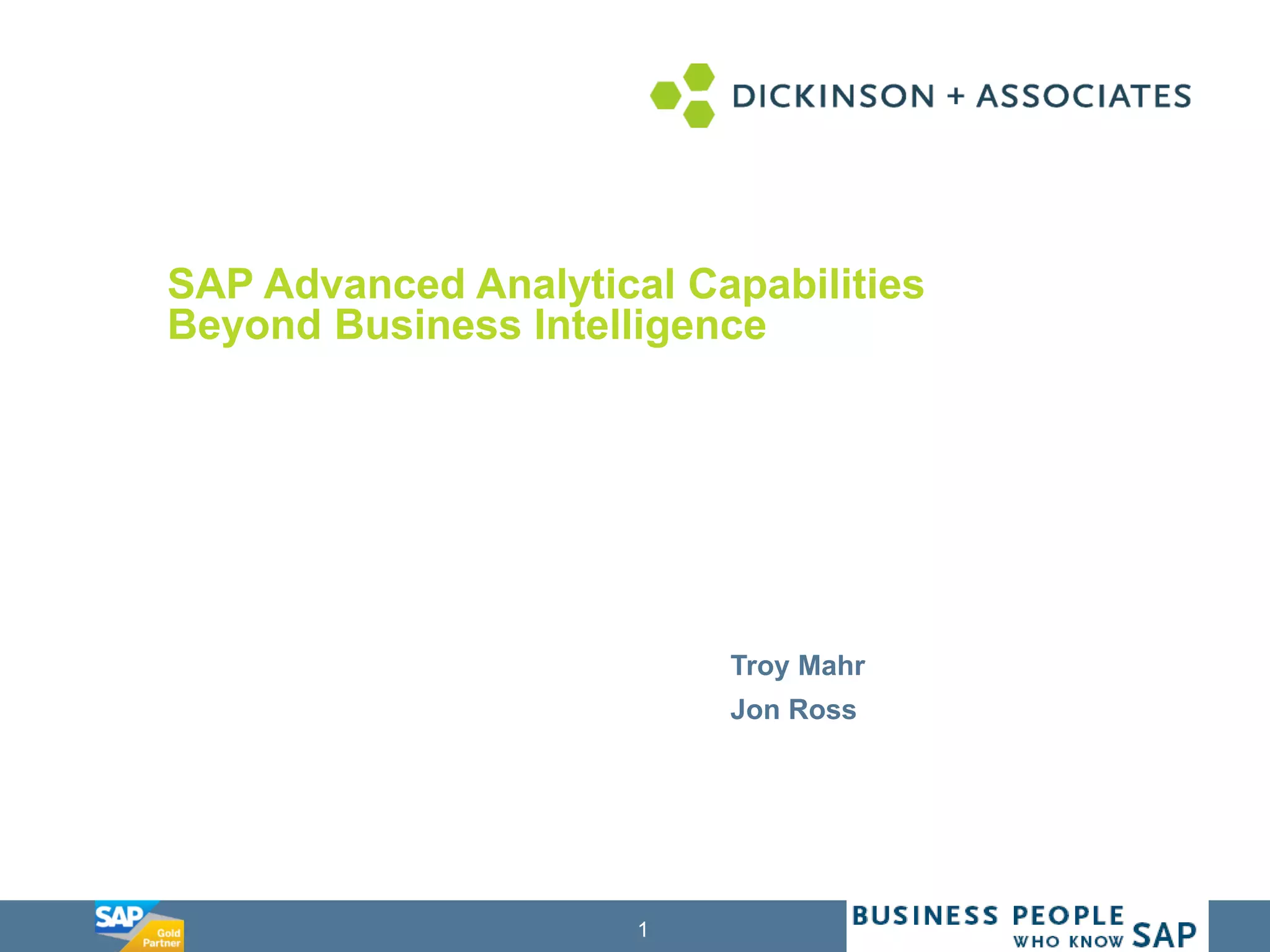 The document discusses the value of advanced analytics, particularly in relation to SAP's various business intelligence tools and predictive analytics. It emphasizes the growing importance of predictive analytics in enhancing business performance, and the competitive advantages organizations gain from it. Key benefits highlighted include improved decision-making, financial performance, and the ability to predict market trends and customer needs.