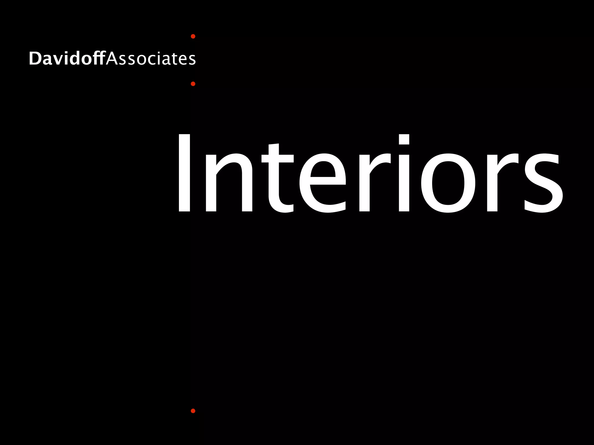 This document lists 5 rooms that Davidoff Associates Interiors has designed: a Master Bedroom Suite, Living Room, Library, Dining Room, and a hand-painted Nursery.