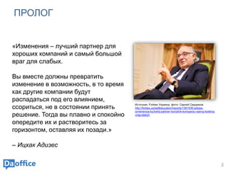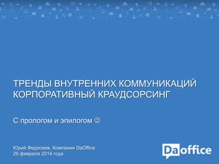 Документ обсуждает применение корпоративного краудсорсинга (КС) для инновационных процессов в компаниях, выделяя его преимущества и общие проблемы, с которыми сталкиваются организации. Он подчеркивает важность активного вовлечения сотрудников в генерацию и реализацию идей, а также необходимость наладки процесса инновирования, адаптированного под специфические условия компании. В заключение подчеркивается, что процесс важнее технологии, и предлагается использовать КС как инновационный подход для повышения эффективности.