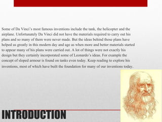Leonardo Da Vinci conceived of many aerial inventions centuries before their practical realization, including designs for an early helicopter, airplane, and parachute. While the materials and technology of his time prevented full construction, his concepts helped lay foundations for modern aviation. He created detailed designs for a flying machine powered by pedals, an anemometer to measure wind, and a large multi-person helicopter driven by hand cranks. Though some like the helicopter were likely not functional, Da Vinci's innovative ideas paved the way for aerial transportation we enjoy today.