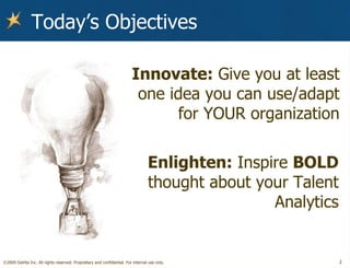 Randy Larson presented on how DaVita improved their recruiting function through innovative analytics. They implemented a new applicant tracking system, built an analytics function, and held recruiters accountable through metrics. This reduced nurse vacancy rates by over 50% and time to fill positions to industry-leading levels. Key changes included tracking time to find candidates, recruiter scorecards, and openly sharing results to build credibility with operations.
