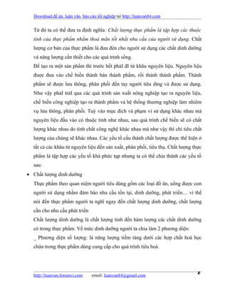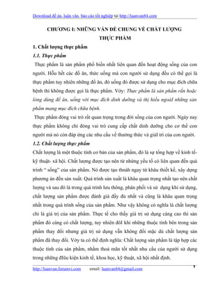 Tài liệu trình bày về chất lượng thực phẩm, định nghĩa thực phẩm và chất lượng thực phẩm như là tập hợp các thuộc tính nhằm thỏa mãn nhu cầu sử dụng của con người. Nó nhấn mạnh rằng chất lượng thực phẩm phụ thuộc vào nhiều yếu tố như nguyên liệu đầu vào, công nghệ chế biến, quá trình bảo quản, khí hậu, và chính sách quản lý nhà nước. Ngoài ra, tài liệu cũng thảo luận về vai trò của doanh nghiệp và nhận thức của người dân trong việc đảm bảo chất lượng thực phẩm.
