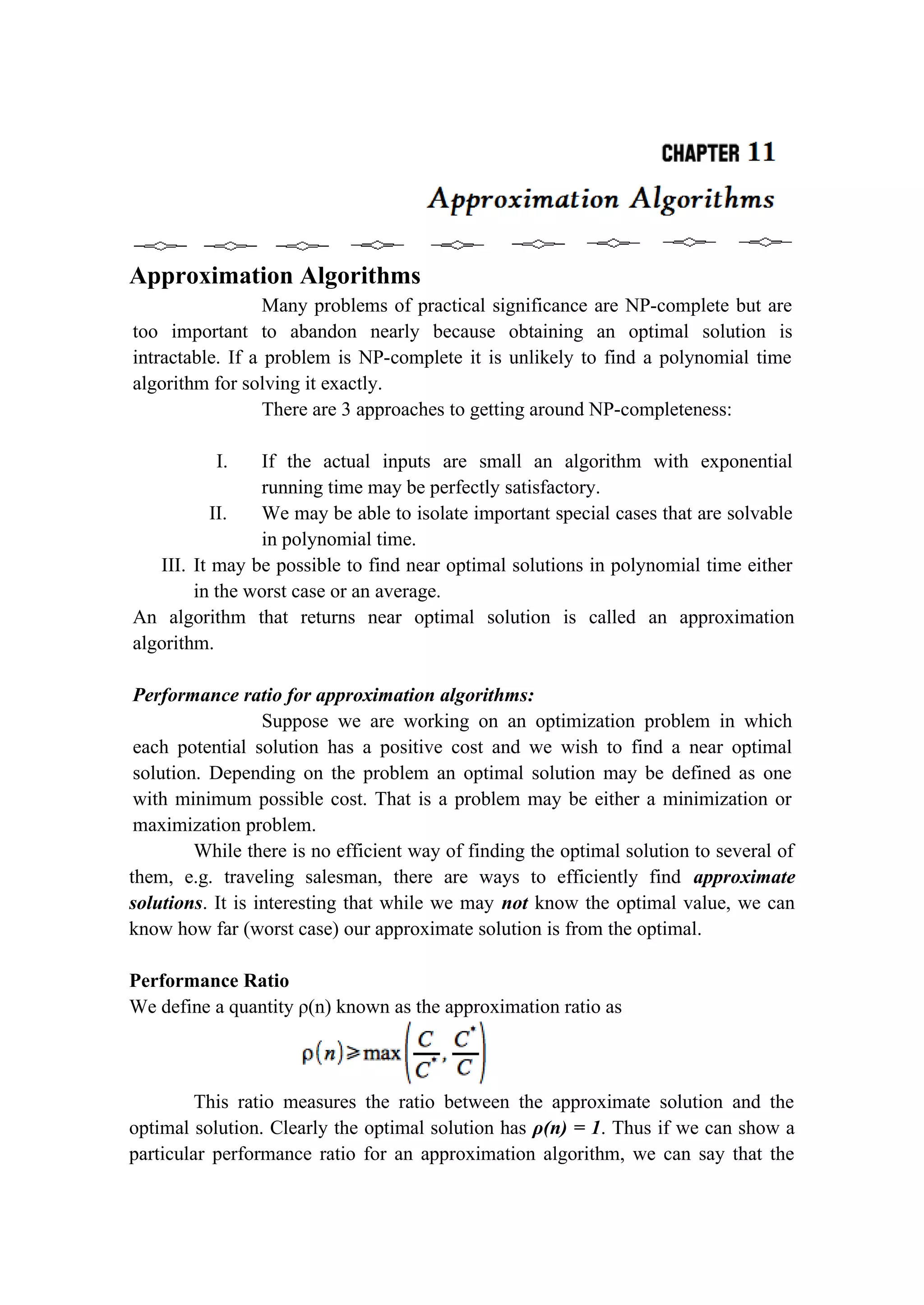 The document discusses approximation algorithms for NP-complete problems. It introduces the concept of approximation ratios, which measure how close an approximate solution from a polynomial-time algorithm is to the optimal solution. The document then provides examples of approximation algorithms with a ratio of 2 for the vertex cover and traveling salesman problems. It also discusses using backtracking to find all possible solutions to the subset sum problem.