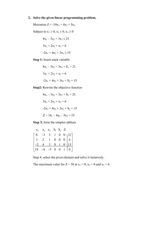 2. Again uses the simplex method to solve another linear programming problem with an objective function and constraints.