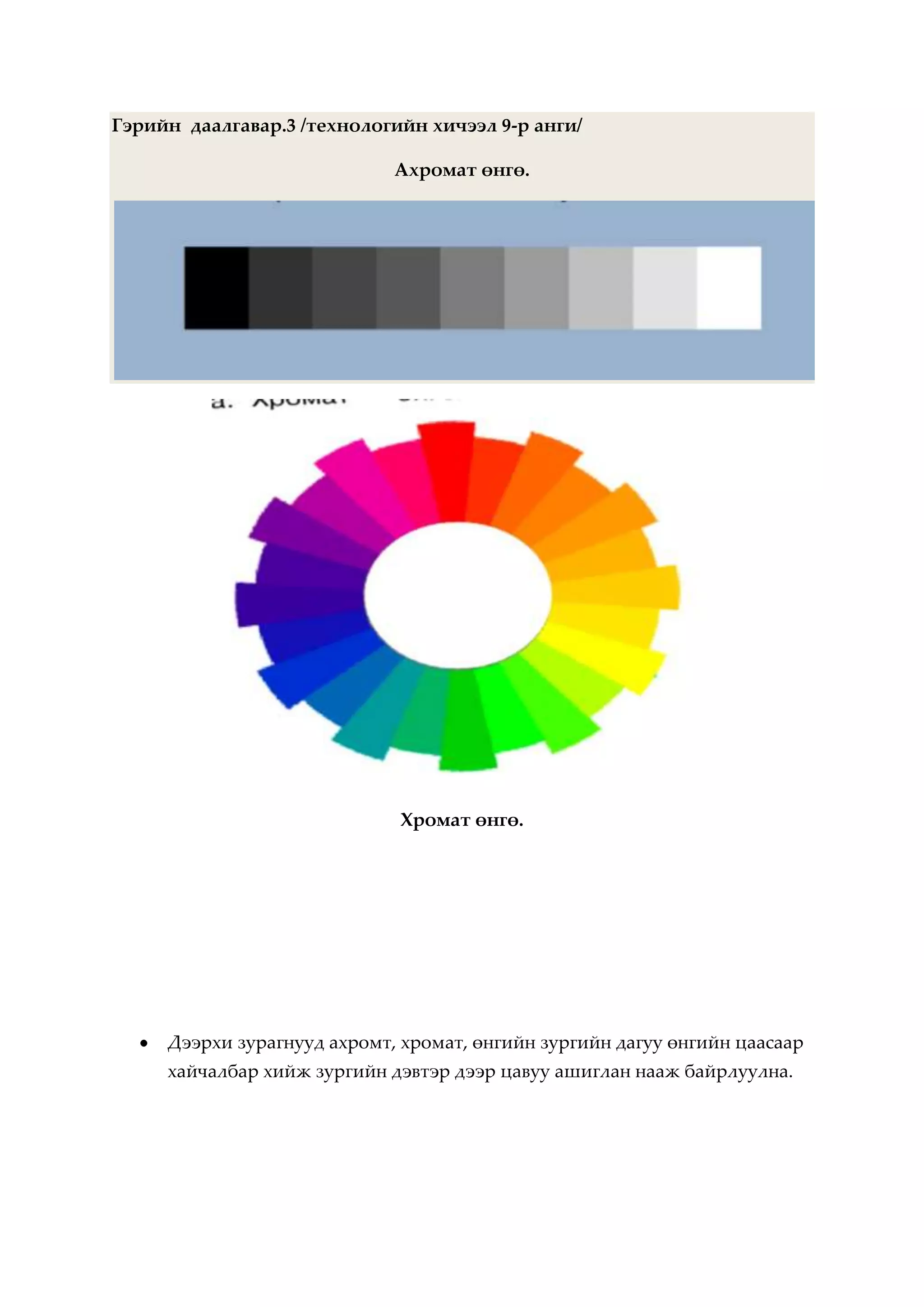 Гэрийн даалгавар.3/технологийн хичээл 9-р анги/<br />Ахромат өнгө.<br />Хромат өнгө.<br />Дээрхи зурагнууд ахромт, хромат, өнгийн зургийн дагуу өнгийн цаасаар хайчалбар хийж зургийн дэвтэр дээр цавуу ашиглан нааж байрлуулна.