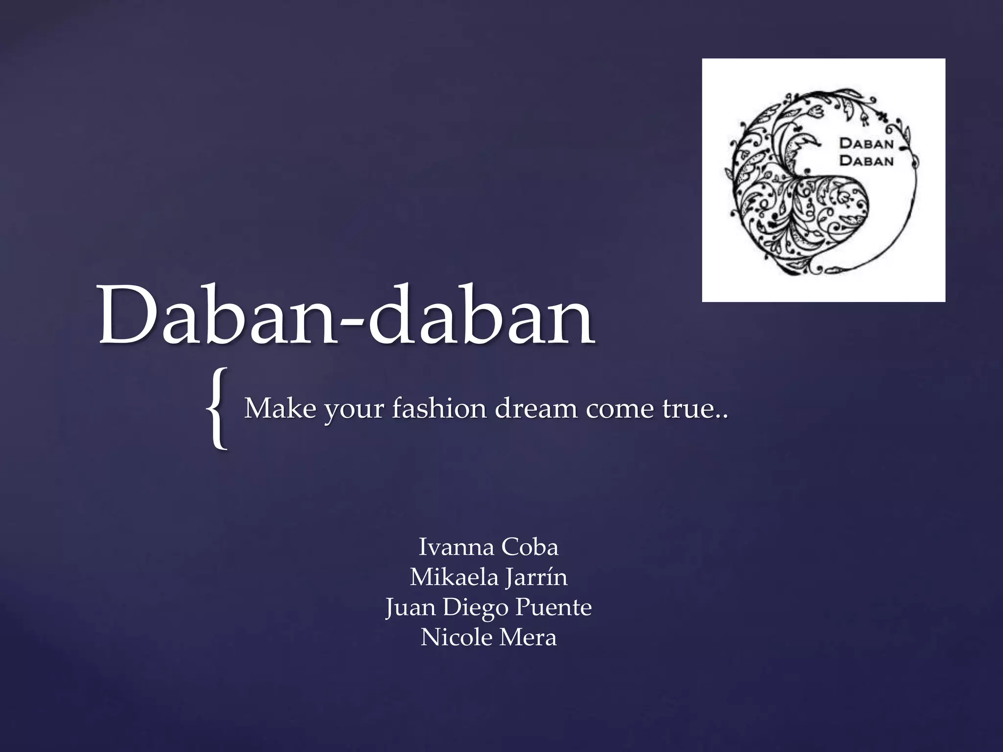 This document describes a clothing company called Daban-daban that makes custom clothing according to customer sketches and specifications. They focus on producing dresses, scarves, shorts, and t-shirts using fabrics like challis, satin, flannel, wool, silk, cashmere, cotton, jean, polyester, jersey, organic cotton, and linen. The prices vary depending on the fabric and additions, with average costs being $19.99 for dresses, $9.99 for scarves, $14.99 for shorts, and $12.99 for shirts. Customers can pay with credit cards or cash by emailing daban-daban@gmail.com.