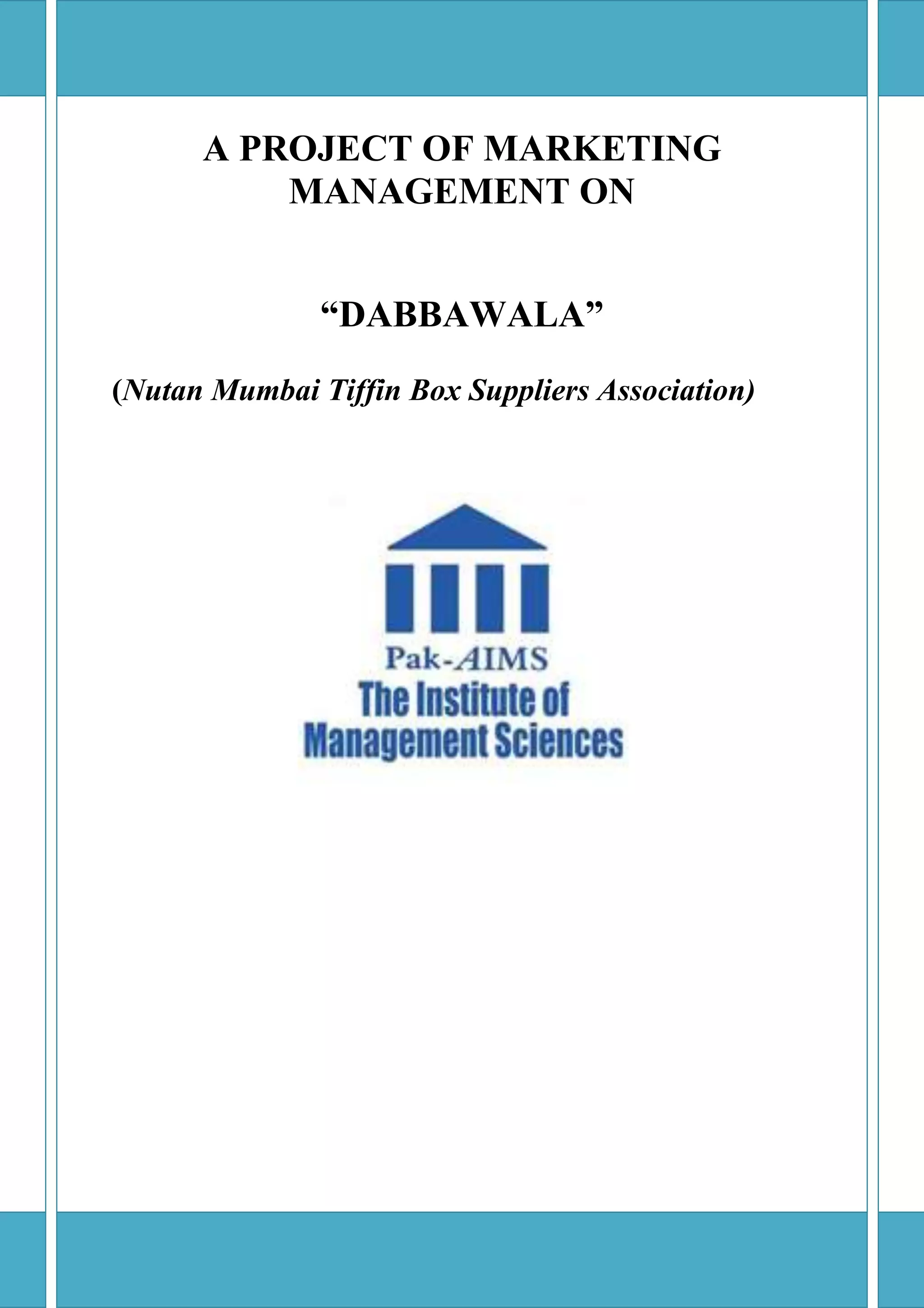 This document provides a marketing report on the Dabbawala service in Mumbai, India. It discusses the history and founding of the Dabbawala organization, their unique supply chain model for delivering home-cooked lunches, their human resource policies and practices, management principles, and a SWOT analysis. The Dabbawala system delivers over 200,000 lunches per day to offices across Mumbai using a low-cost and highly efficient process involving bicycles, local trains, and sorting at various stations.