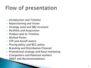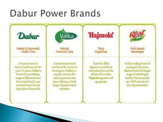 Dabur is one of India's leading FMCG companies known for its Ayurvedic and natural products portfolio. It has five flagship brands with distinct identities covering healthcare, personal care, and beverages. Dabur was established in 1884 and has grown over the decades through new product launches, acquisitions, and repositioning itself as an FMCG company in 2004. It uses an expansion, acquisition, innovation, and regional branding strategy. Hajmola is one of Dabur's major brands and digestive product with over 60% market share that is promoted through integrated strategies targeting rural consumers. Porter's five forces analysis indicates threats from substitutes but lower risks of new competition or supplier power given Dab