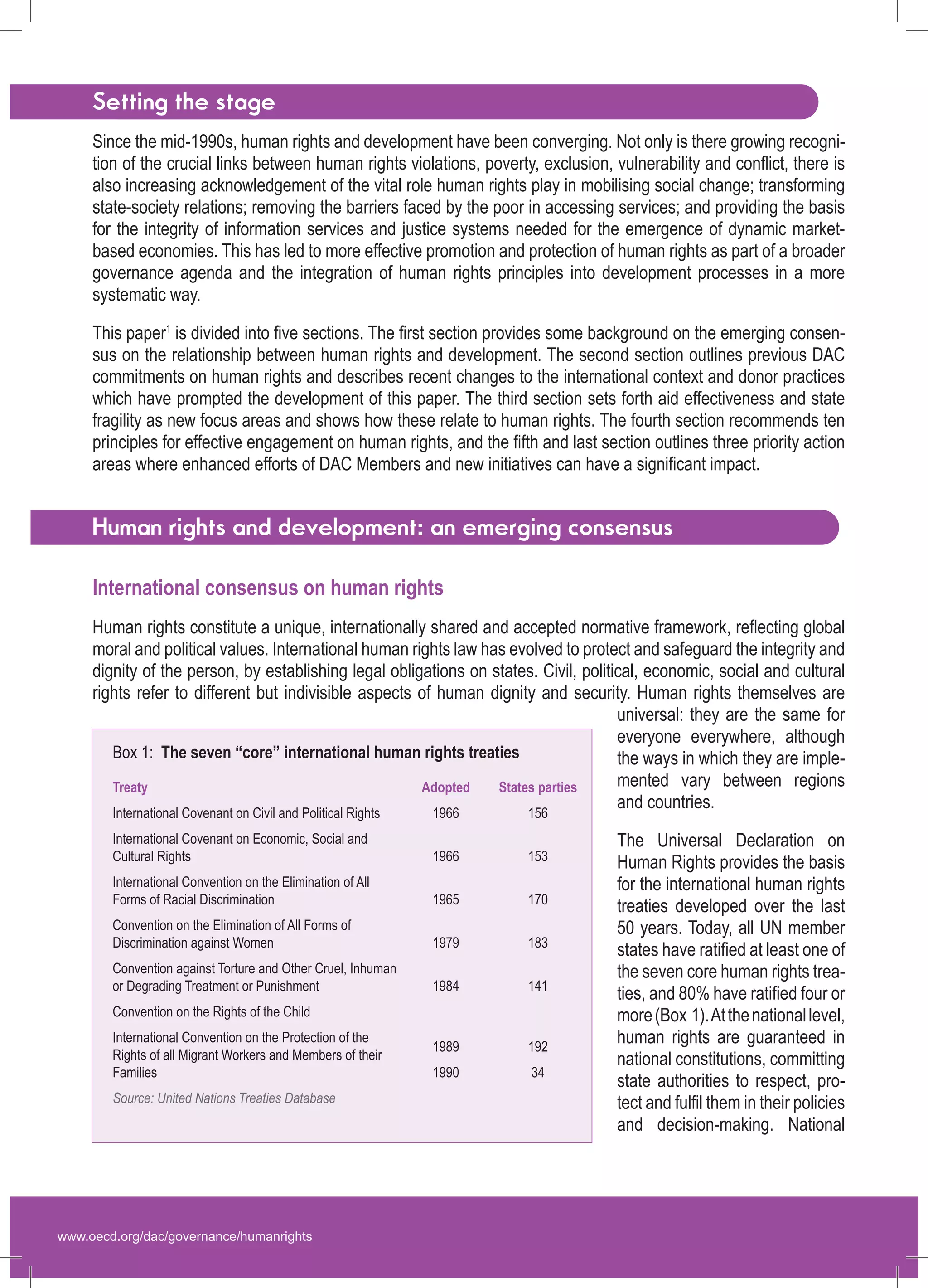 This document summarizes a policy paper by the OECD's Development Assistance Committee (DAC) on promoting human rights and development. It outlines how human rights and development have increasingly converged over the past decade as more donors seek to comprehensively promote human rights to improve development cooperation. The DAC conducted a review to foster consensus among donors on how to address human rights more strategically. The review identified 10 principles to guide donor action in key areas like state-building and aid effectiveness.